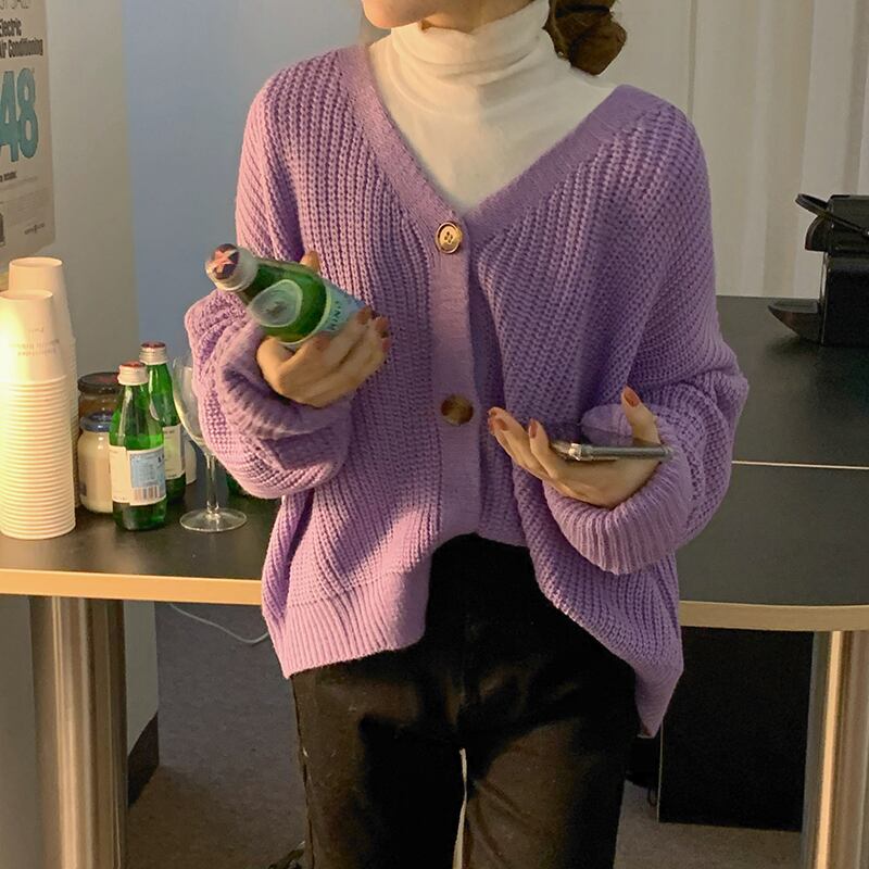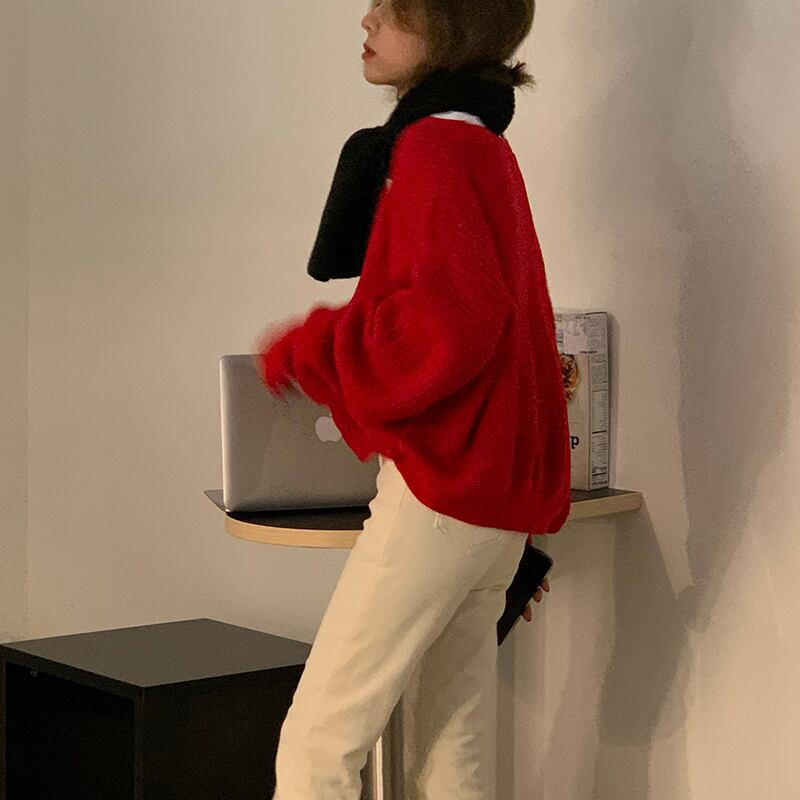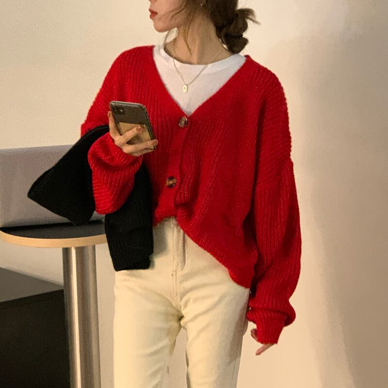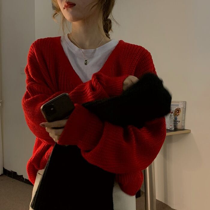 ルーズレッドニットカーディガンスプリングVネックセーター コート ジャケット レディース 春物 モンロー93633147888