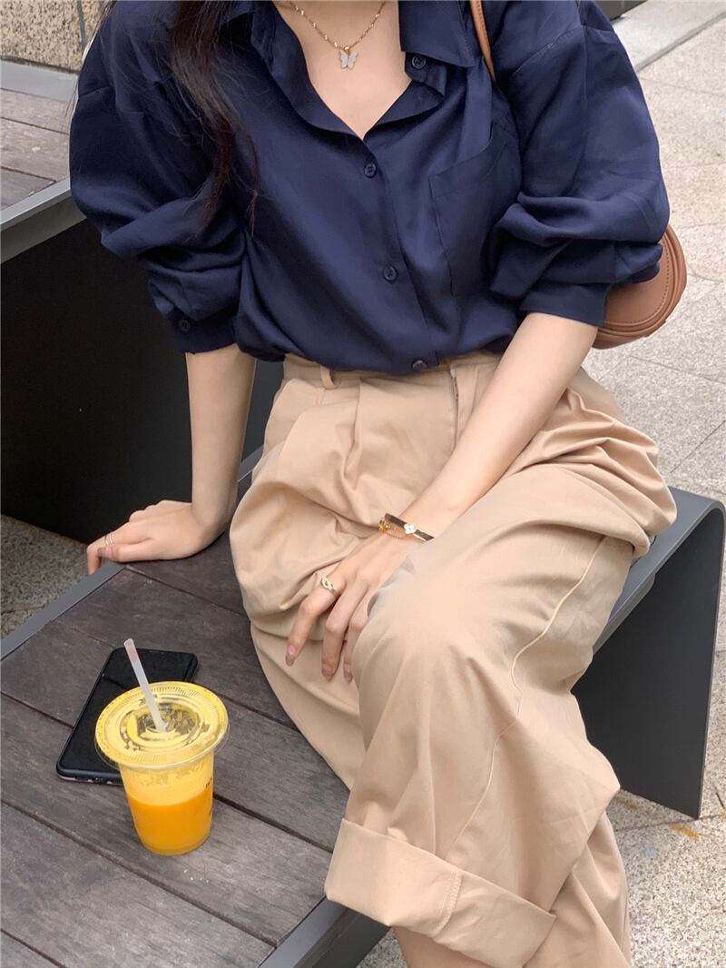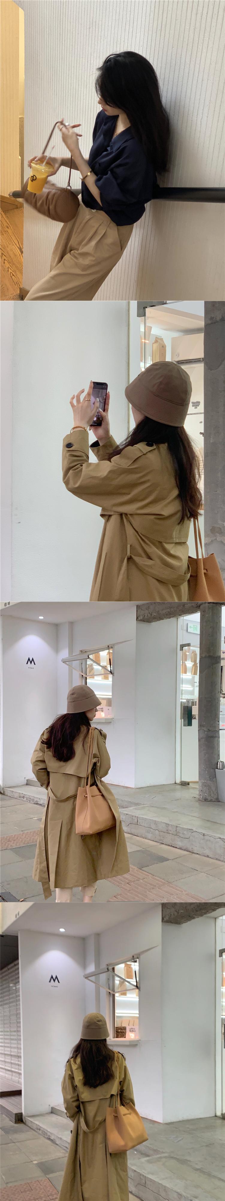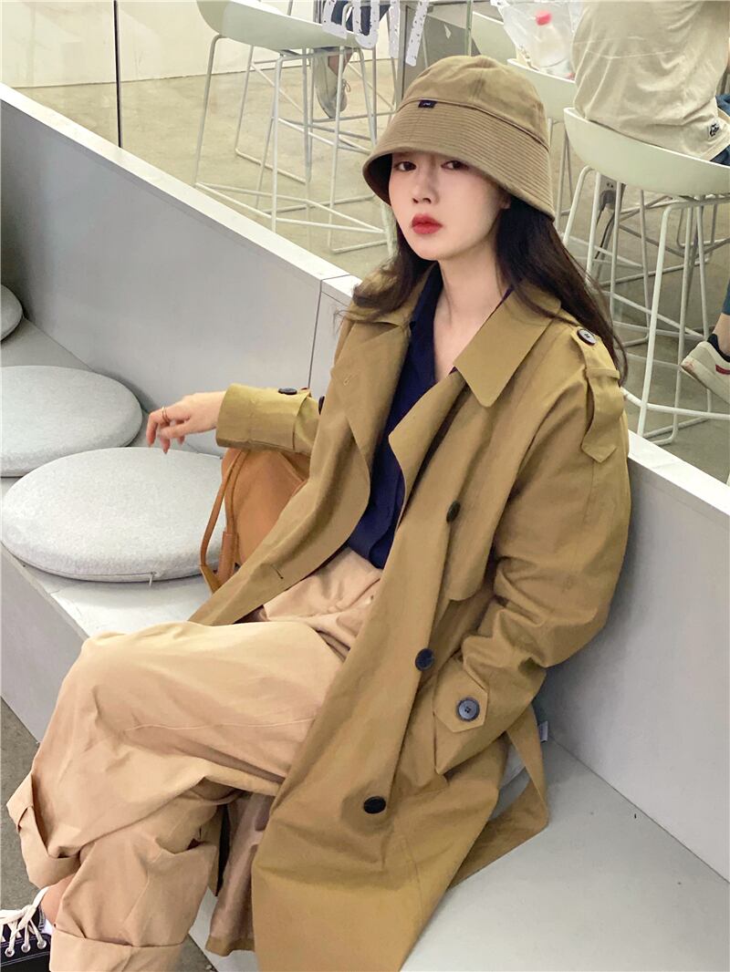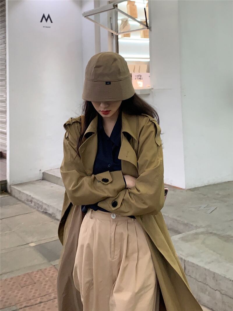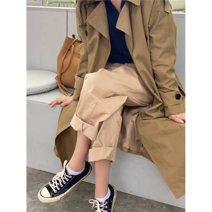 色:ゴールデンブラウンのトレンチコート,ネイビーブルーのシャツ,カーキワイドレッグパンツ