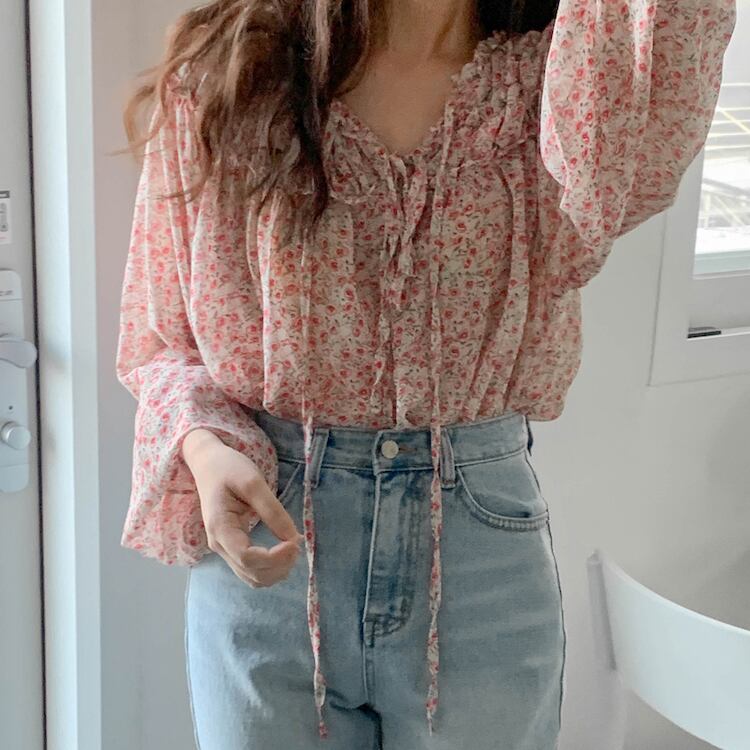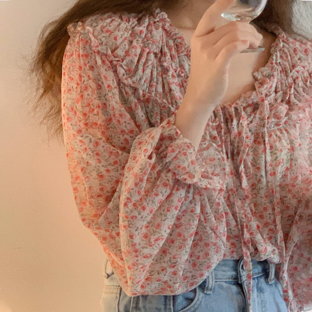 フローラルシフォンシャツ レディースルーズカーディガンジャケット スプリングVネックスタイル ロング 春物 花柄 モンロー30872777423