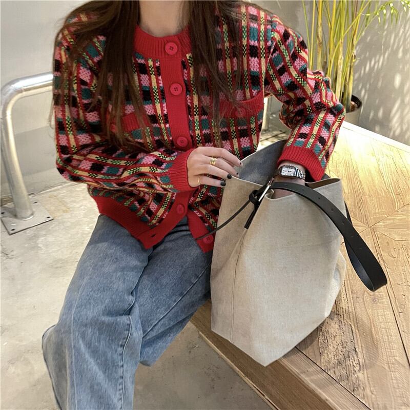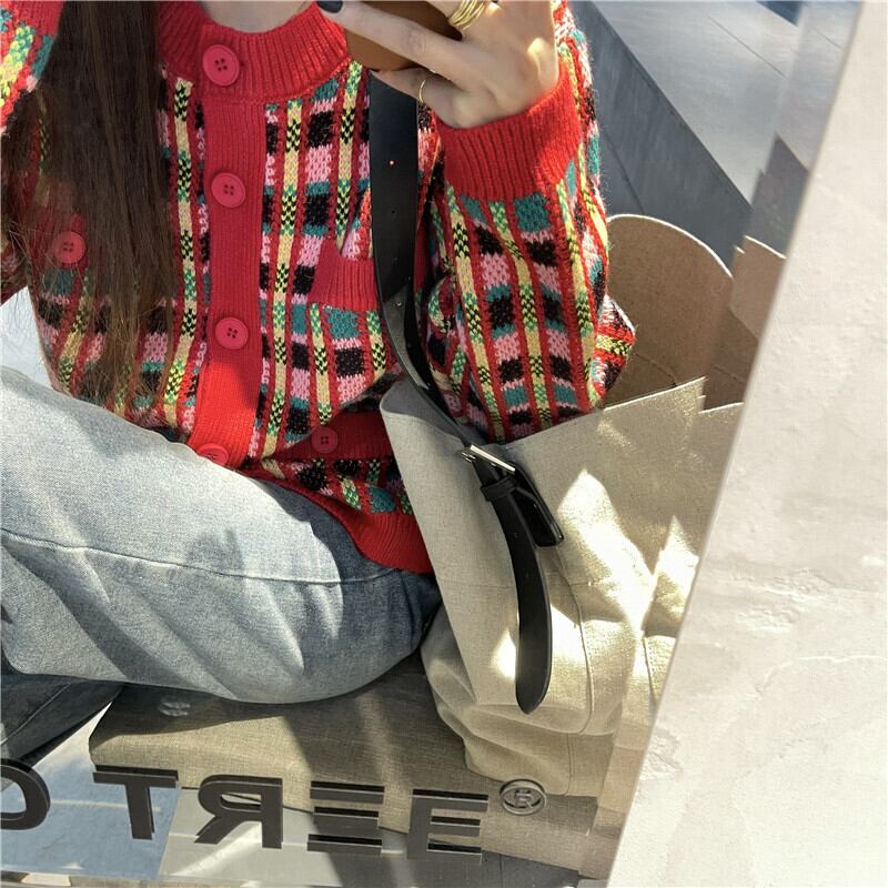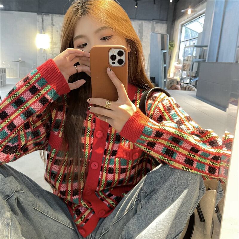 スタンダードレッド格子柄ニットカーディガンスプリングセーター コート クロップドトップス レトロ 春物 モンロー55012631271