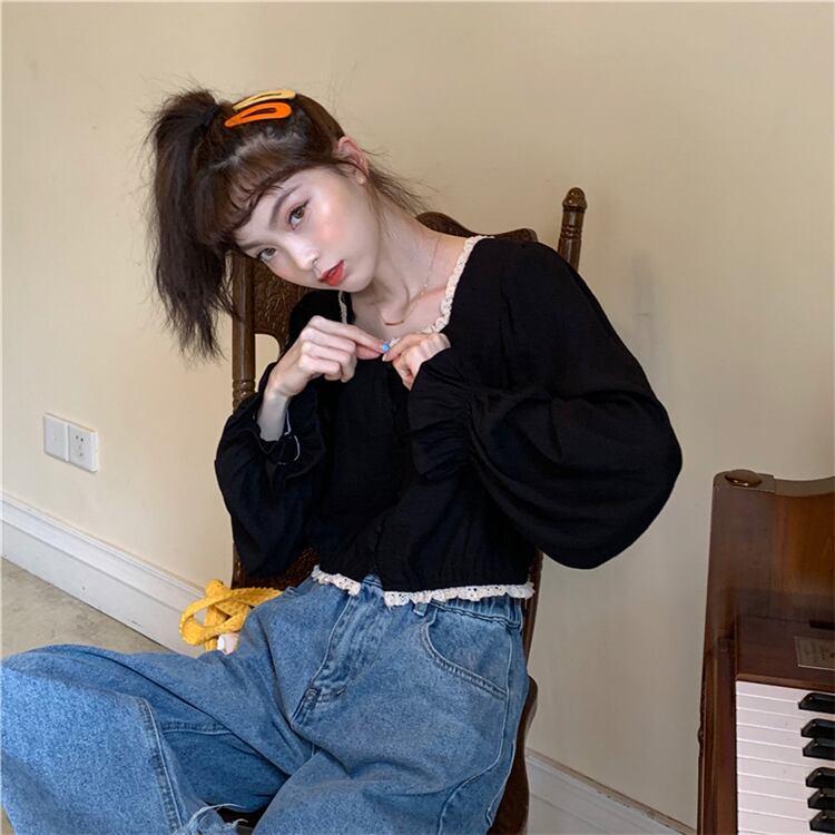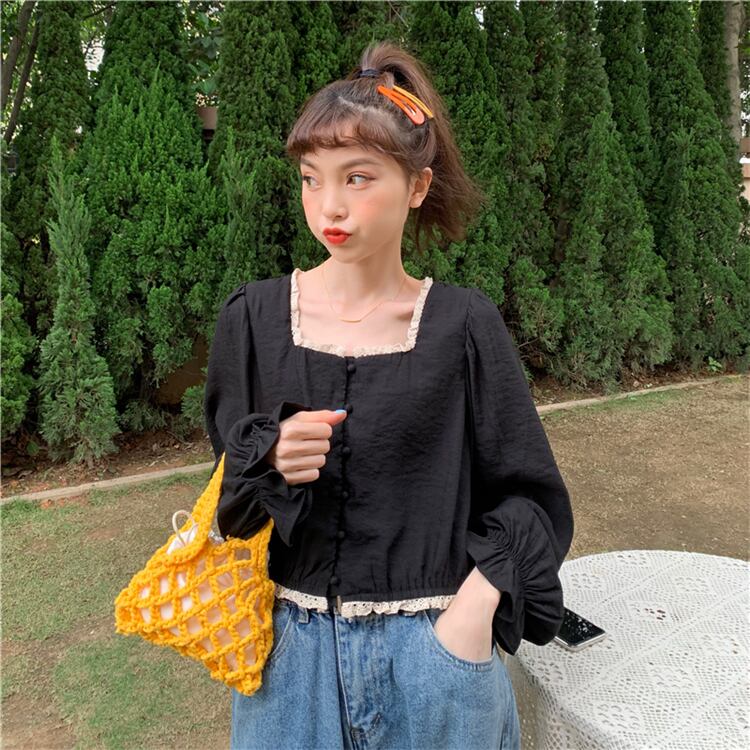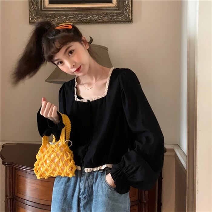 スタンダードブラックシフォンシャツ スプリングショート ロング レトロ 春物 スクウェア モンロー18595753957