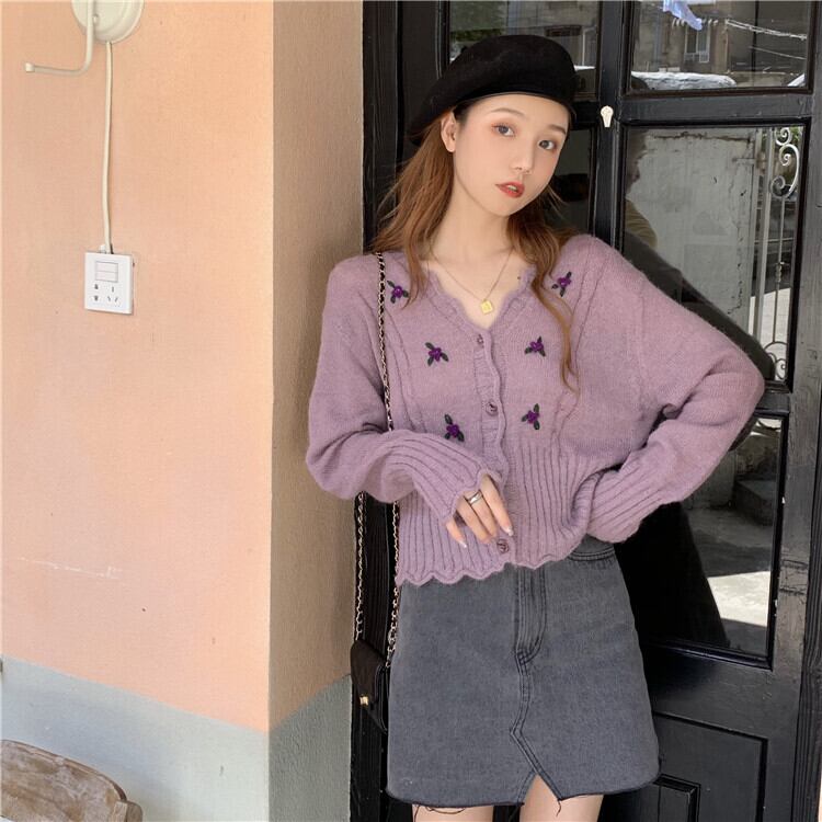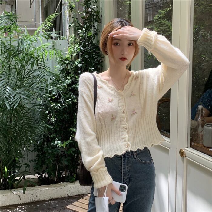 スタンダードフローラルニットカーディガンスプリングVネックセーター ジャケット ルーズショートトップス レトロ 春物 花柄 モンロー95618707793