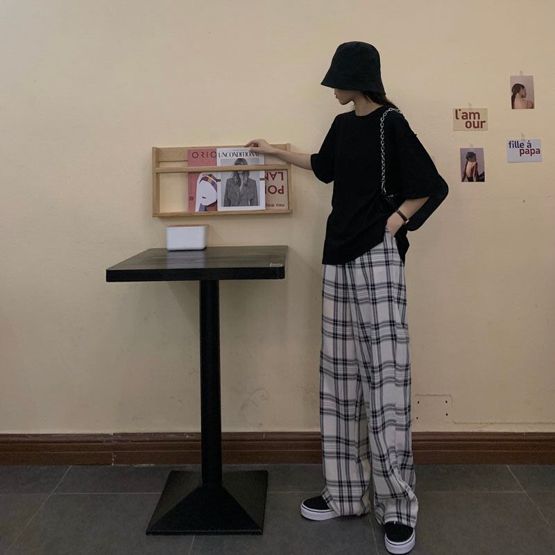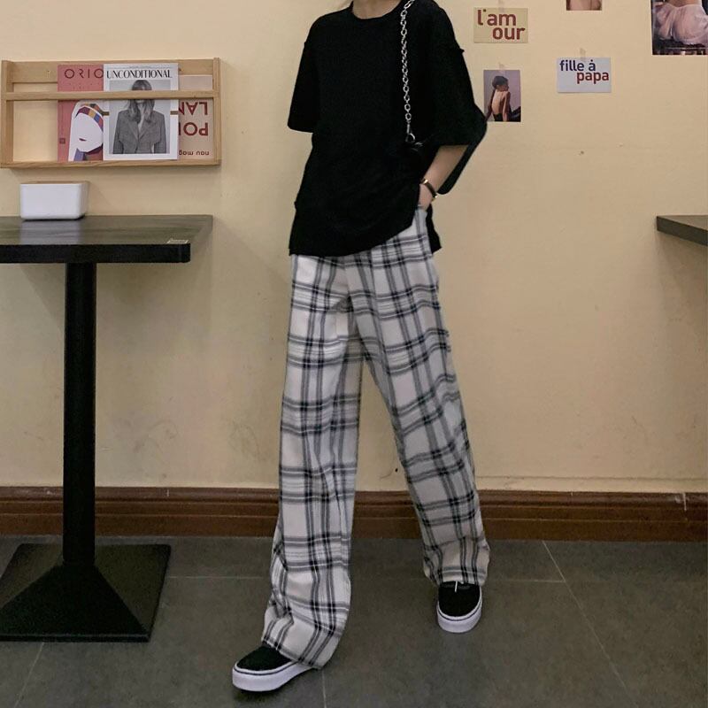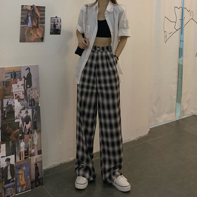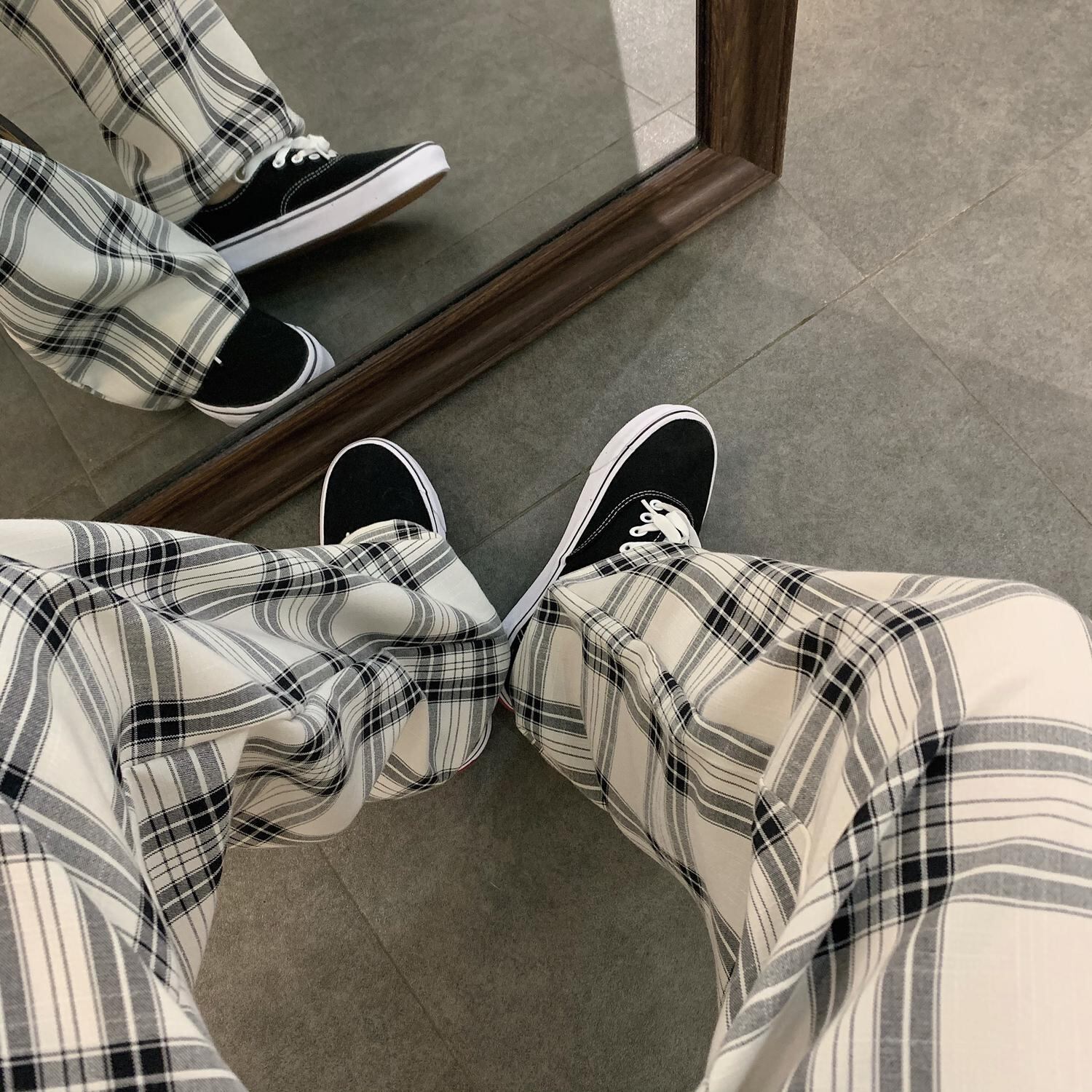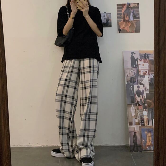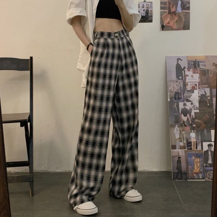 格子柄ワイドレッグパンツ レディースハイウェストウェストルーズサマーカジュアル 夏物 ワイドパンツ モンロー38981799565