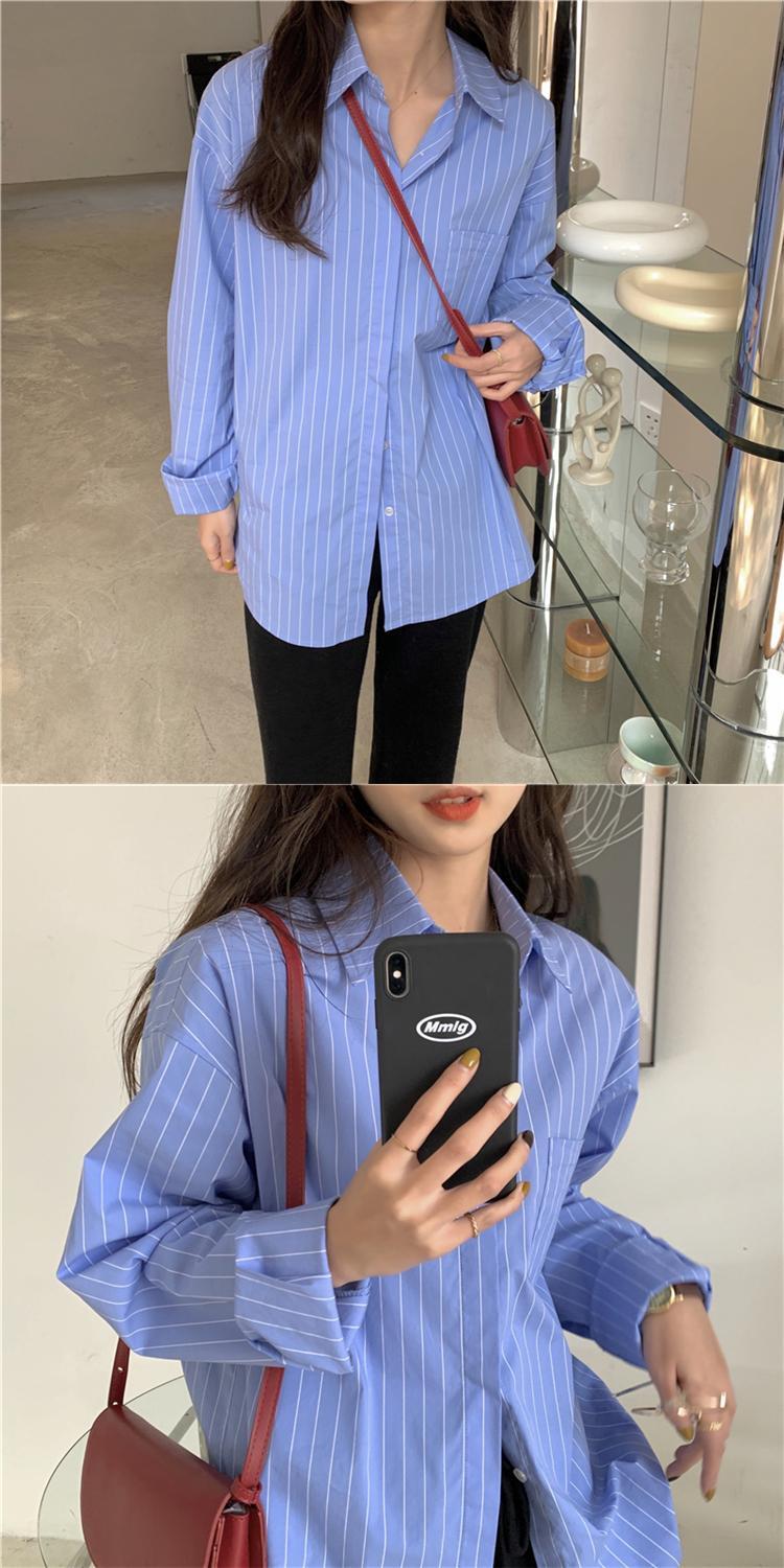 ブルーストライプシャツ ルーズジャケット スプリングトップス ロング 春物 モンロー52596899614