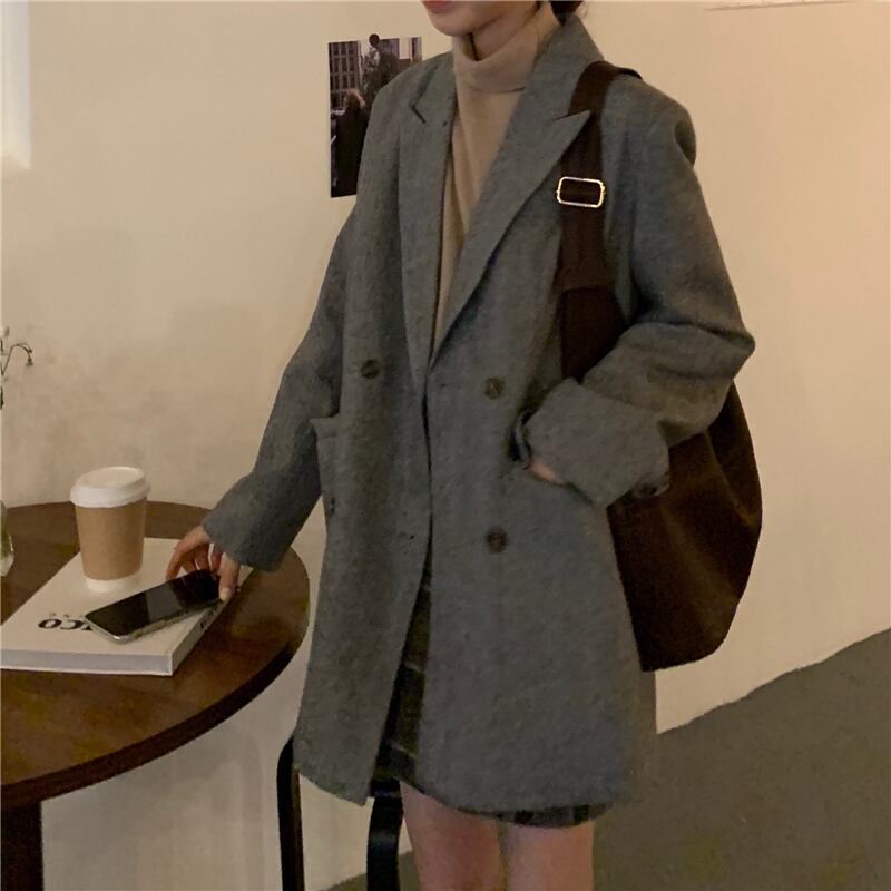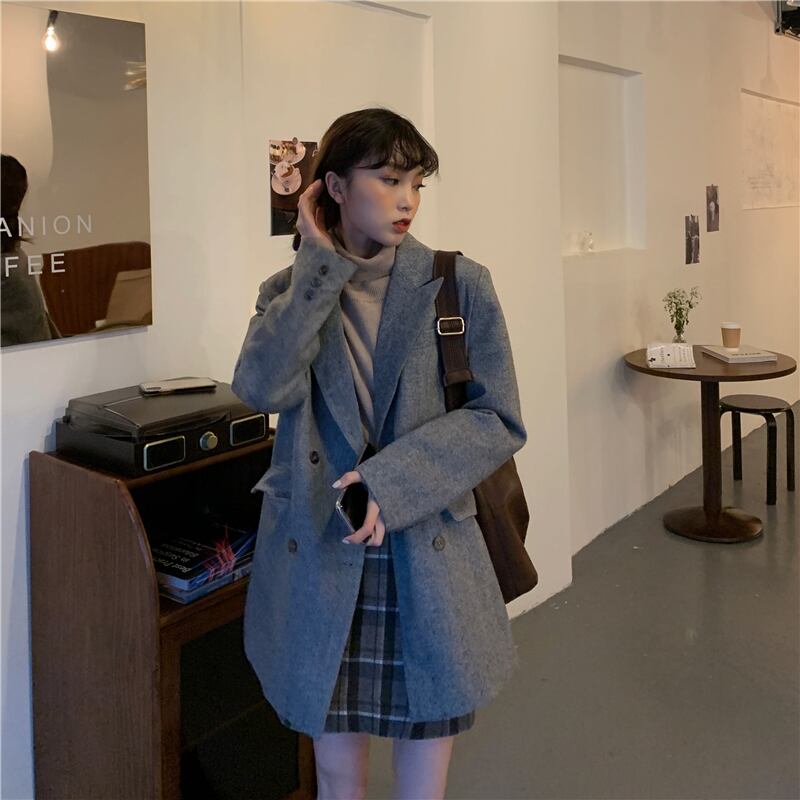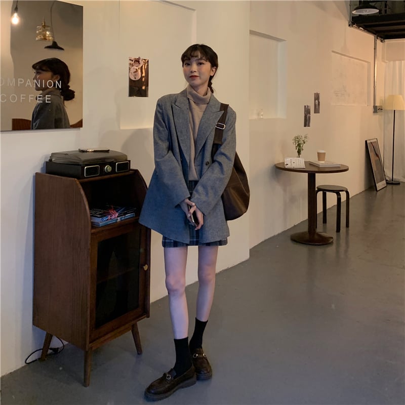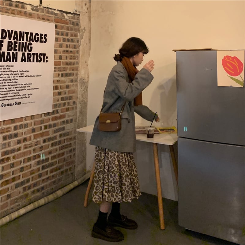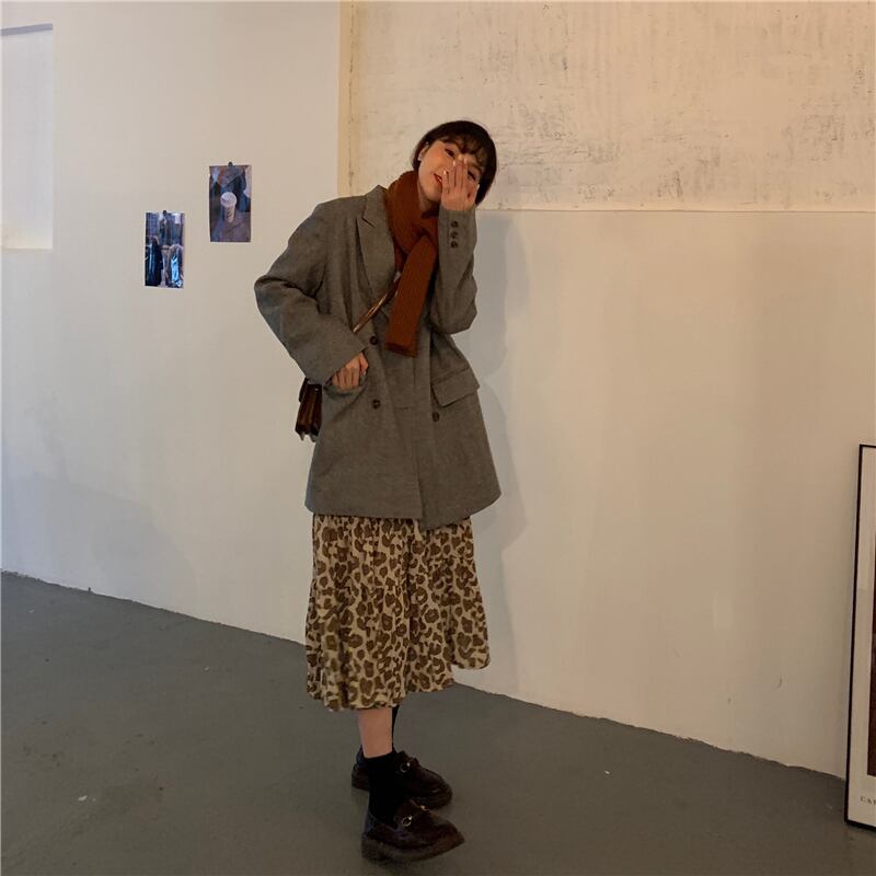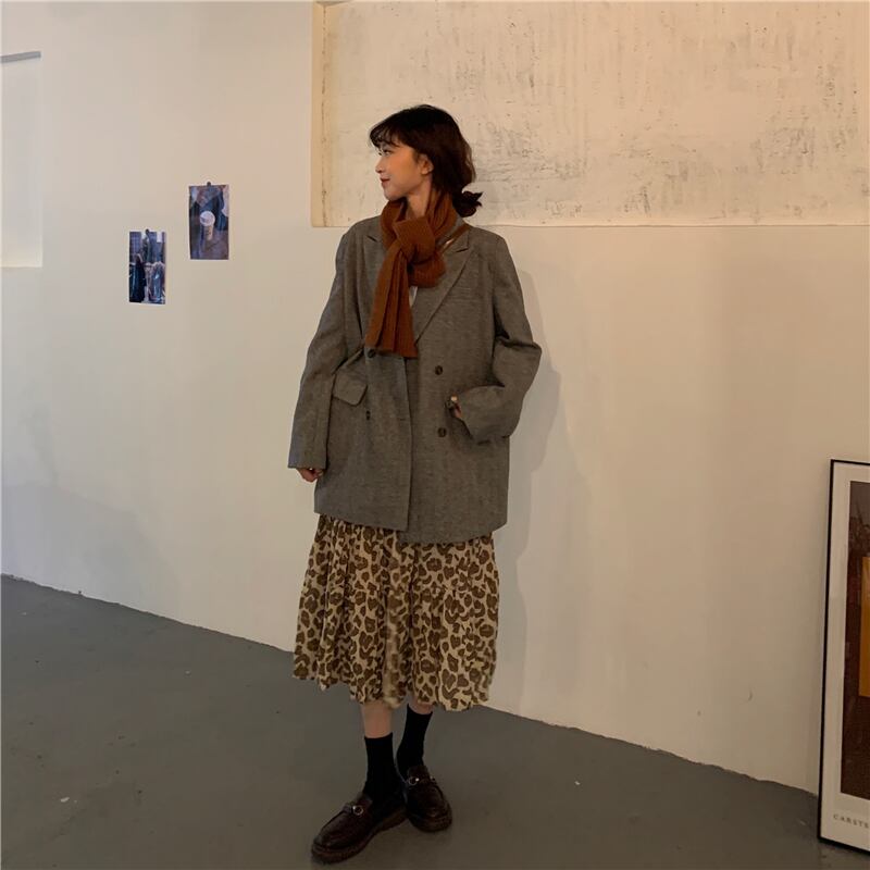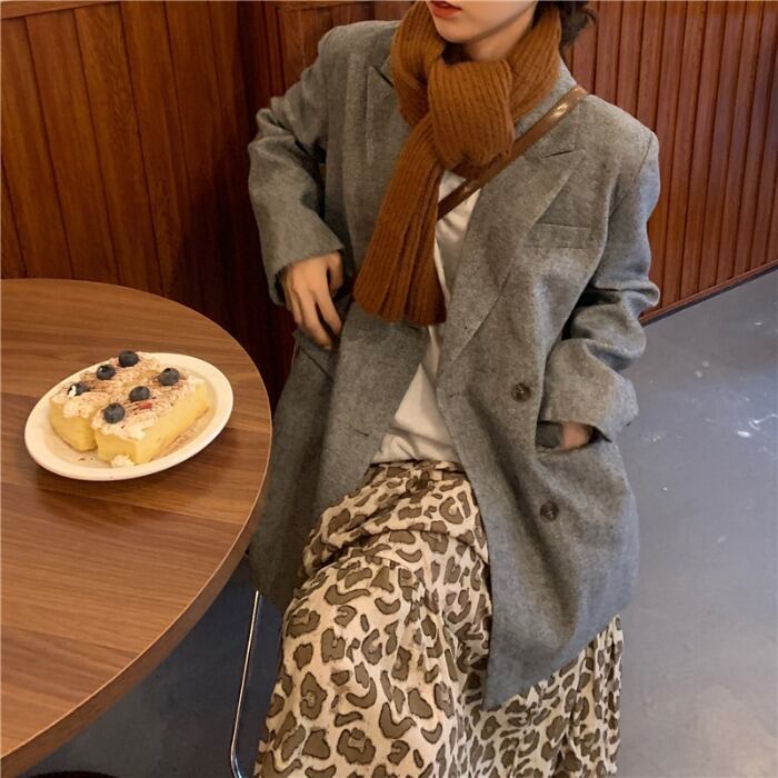 色:ヘンプグレーのスーツ,ヒョウスカート