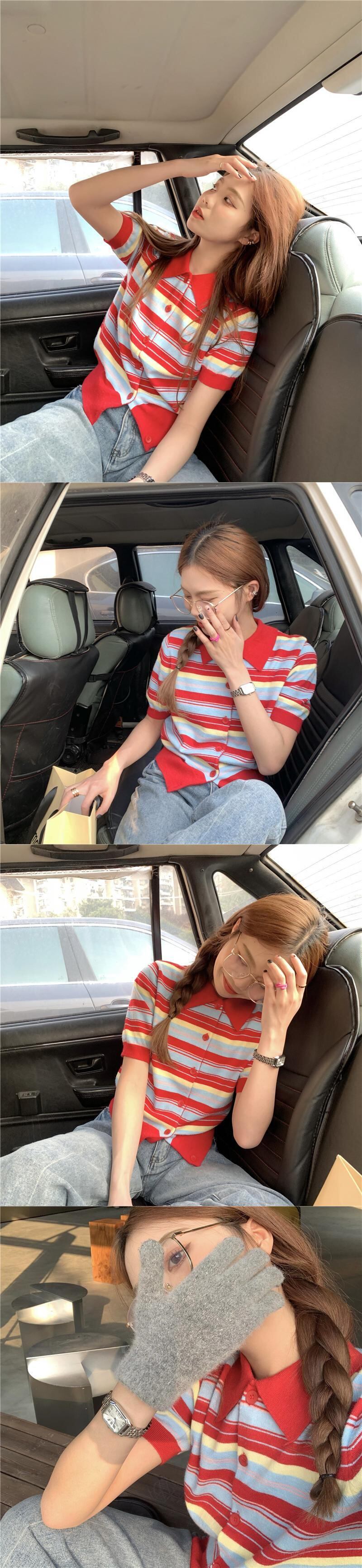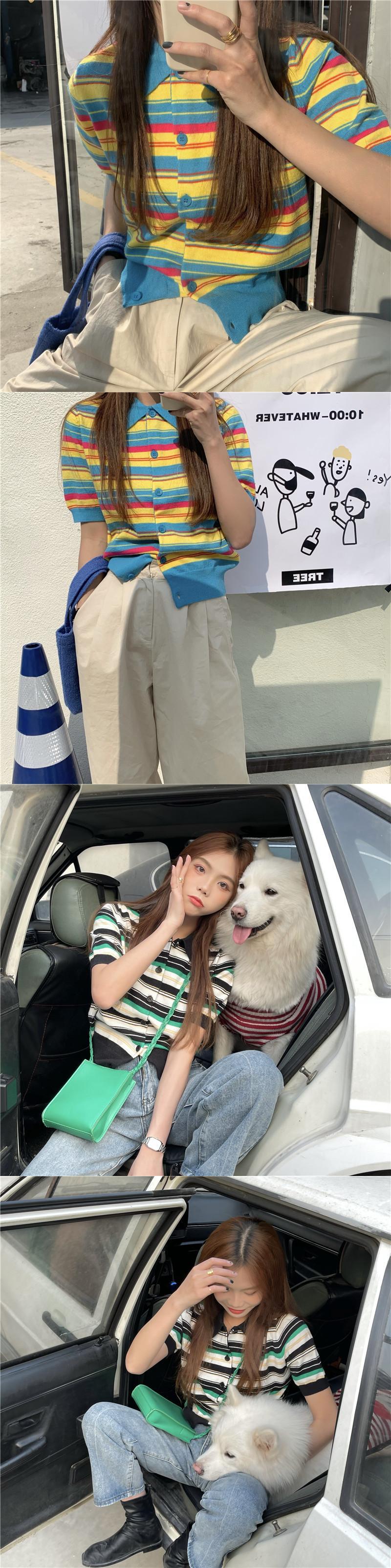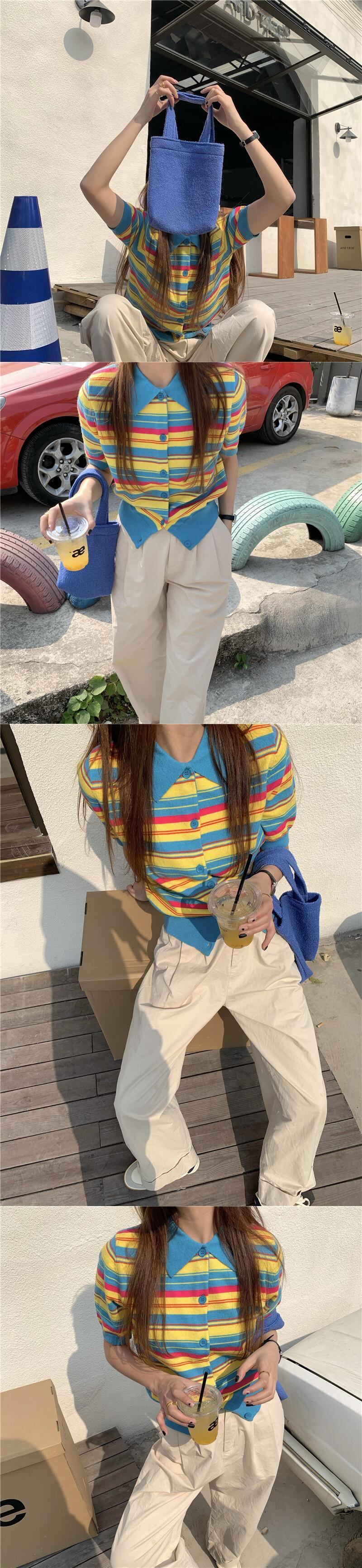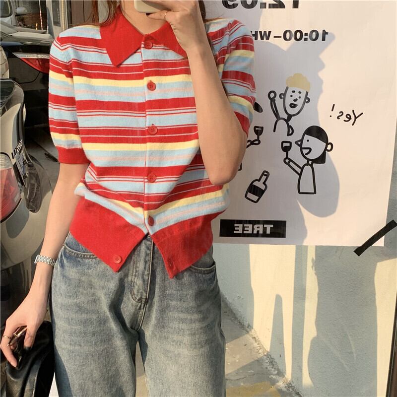スタンダードストライプTシャツ レディースルーズカーディガンスプリングカラークロップトップ トップス レトロ 春物 モンロー65054505016
