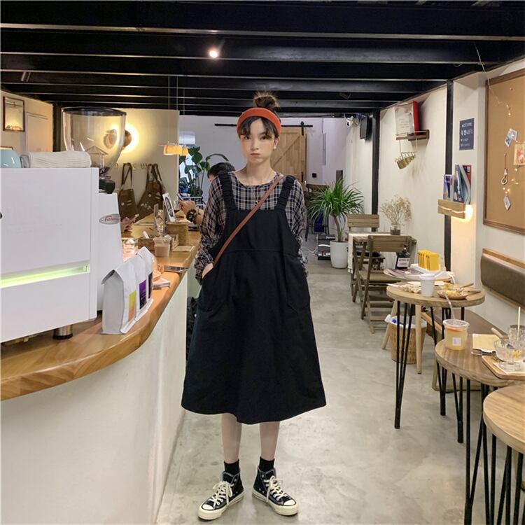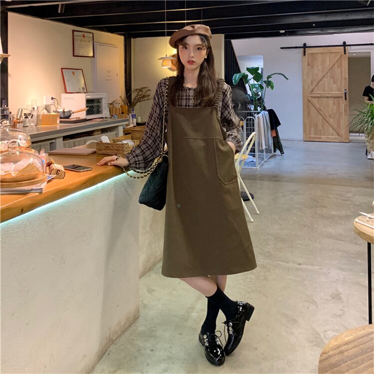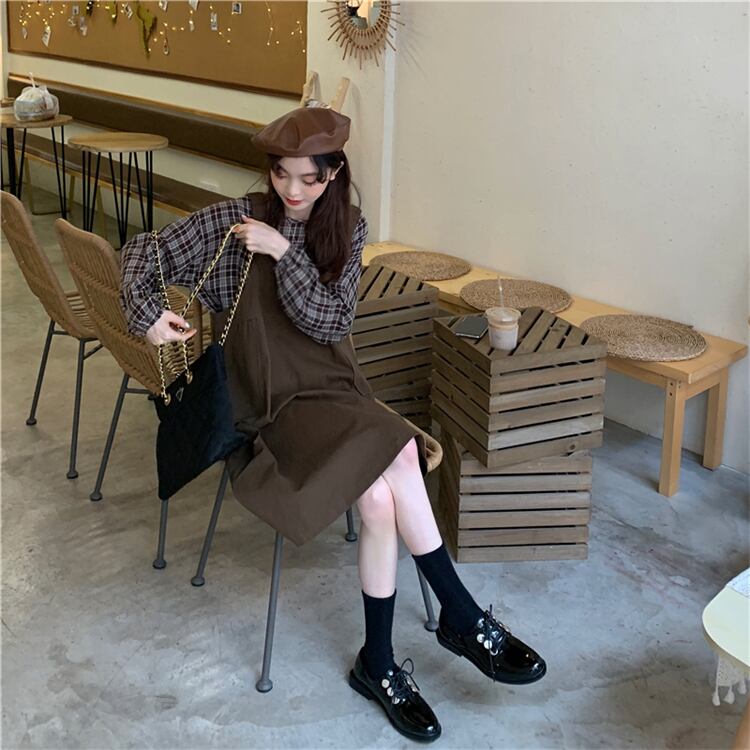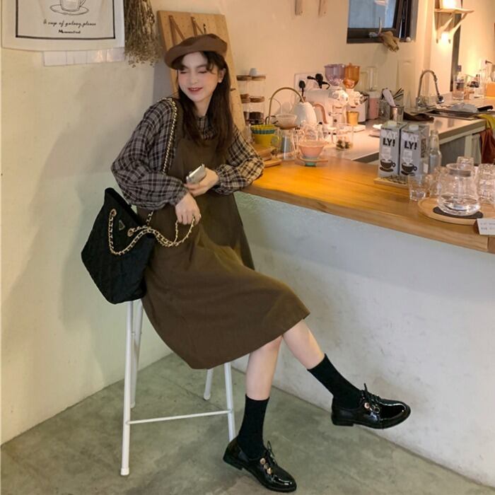 色:カーキ色のスカート,黒スカート,カーキチェックシャツ,ネイビーチェックシャツ