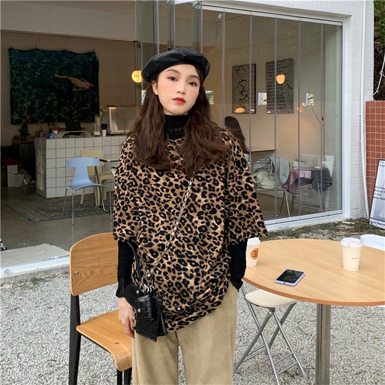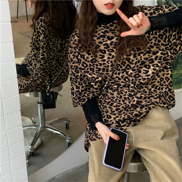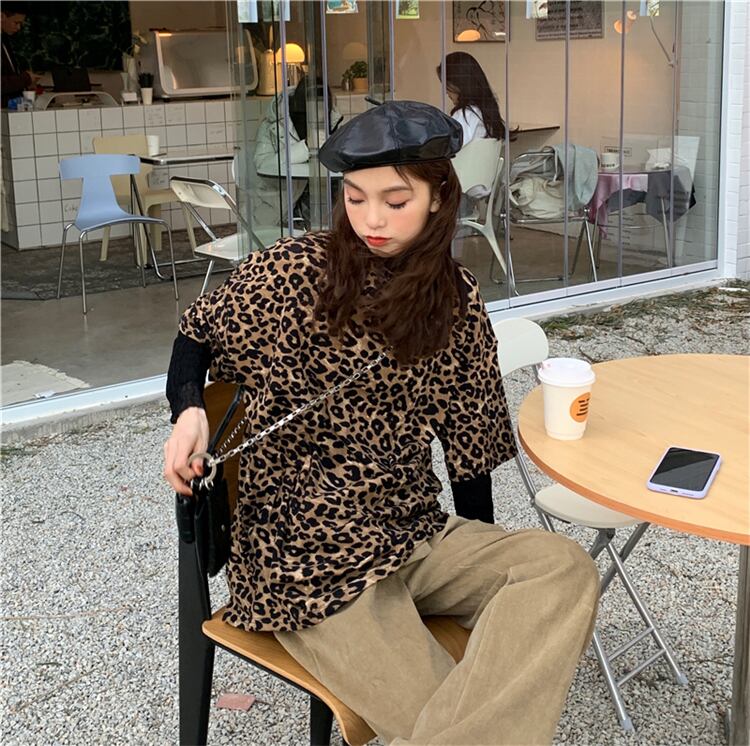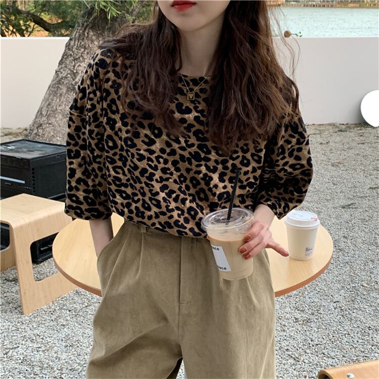 スタンダードレオパードプリント柄Tシャツ シャツ スプリングルーズスタイル レトロ 春物 モンロー29813730856