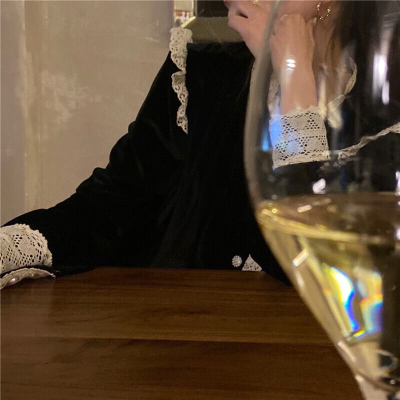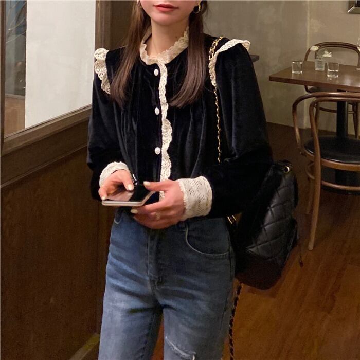 スタイルブラックベルベットシャツ レディーススタンダードスプリングジャケット トップス ロング レトロ 春物 モンロー70872969943