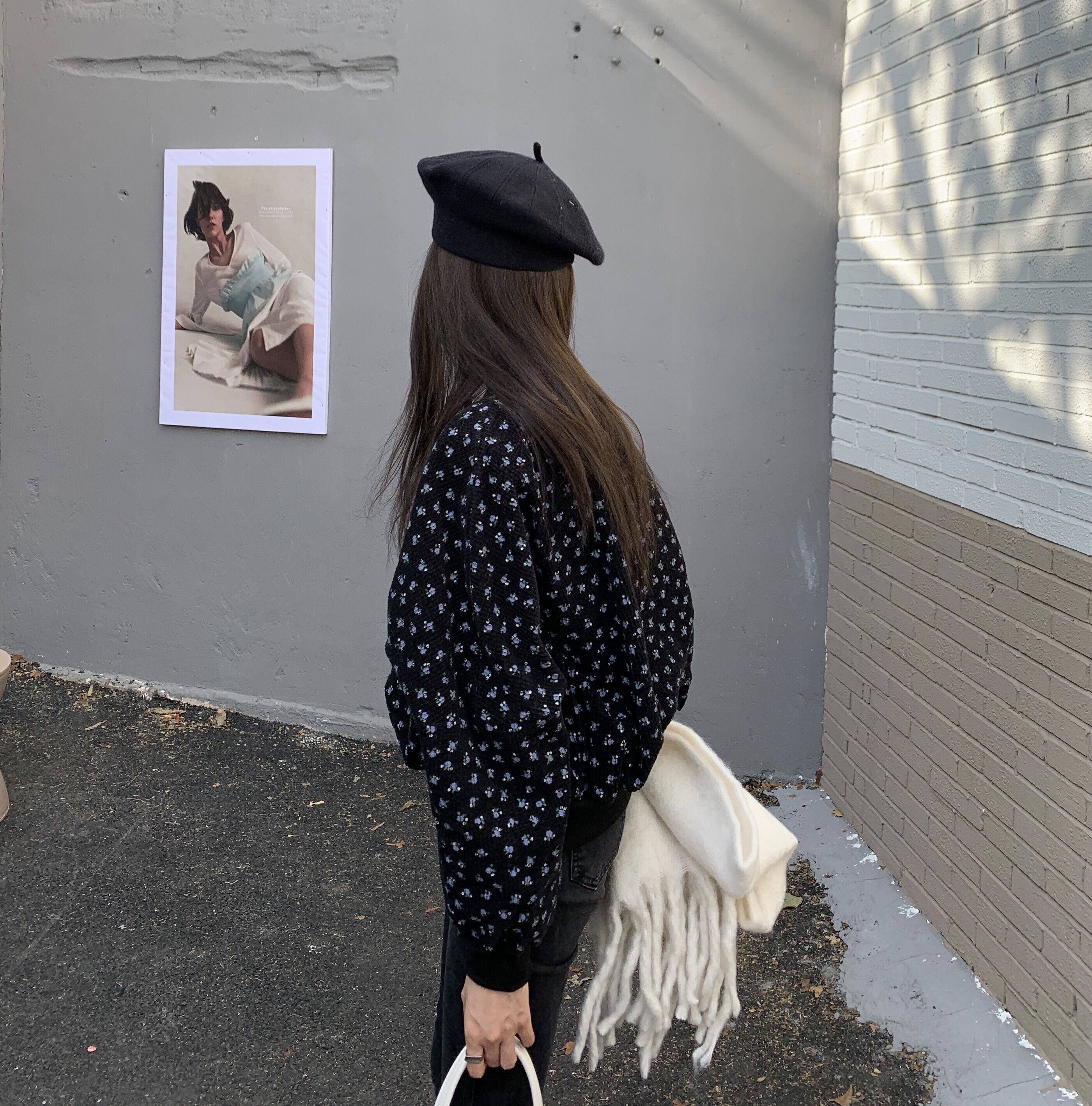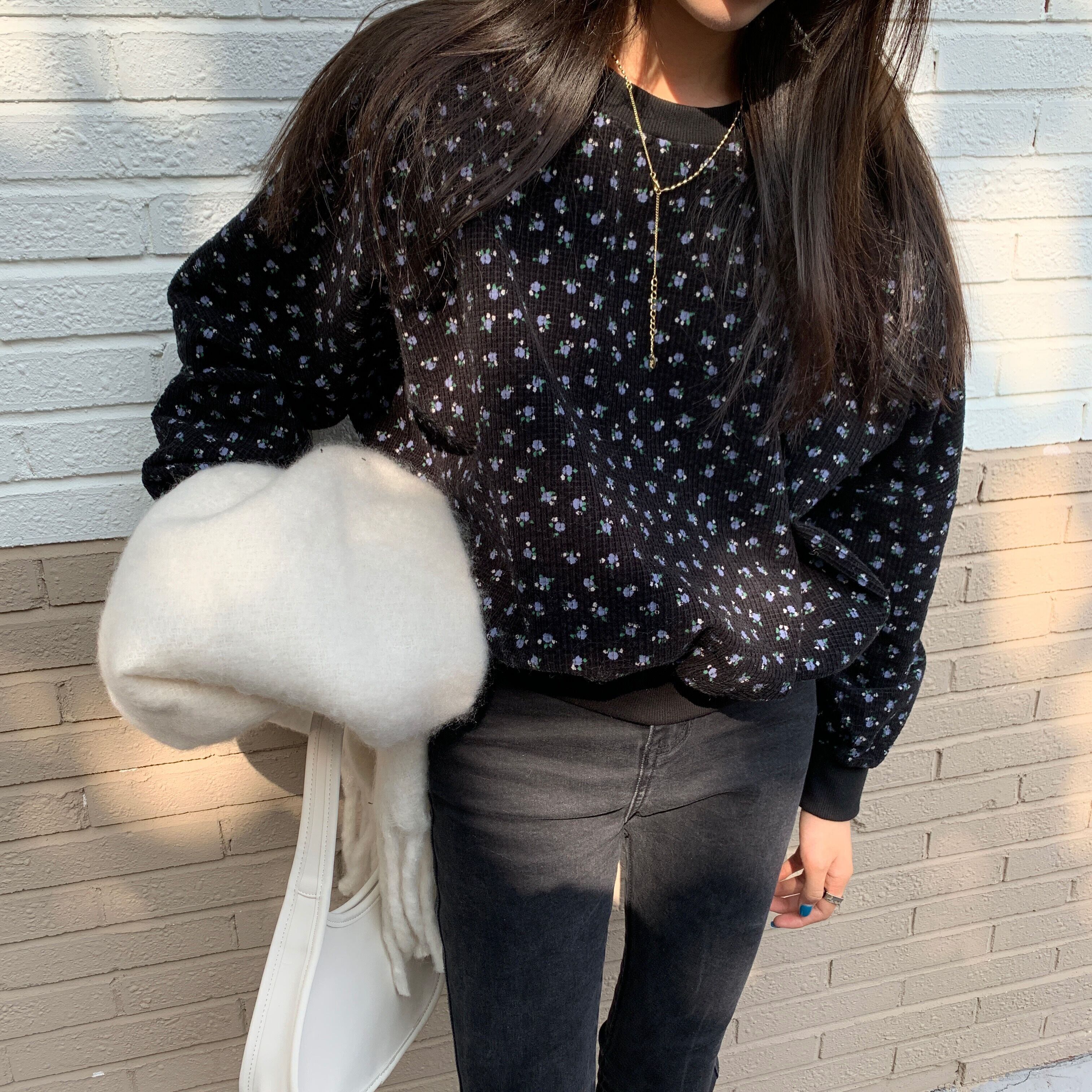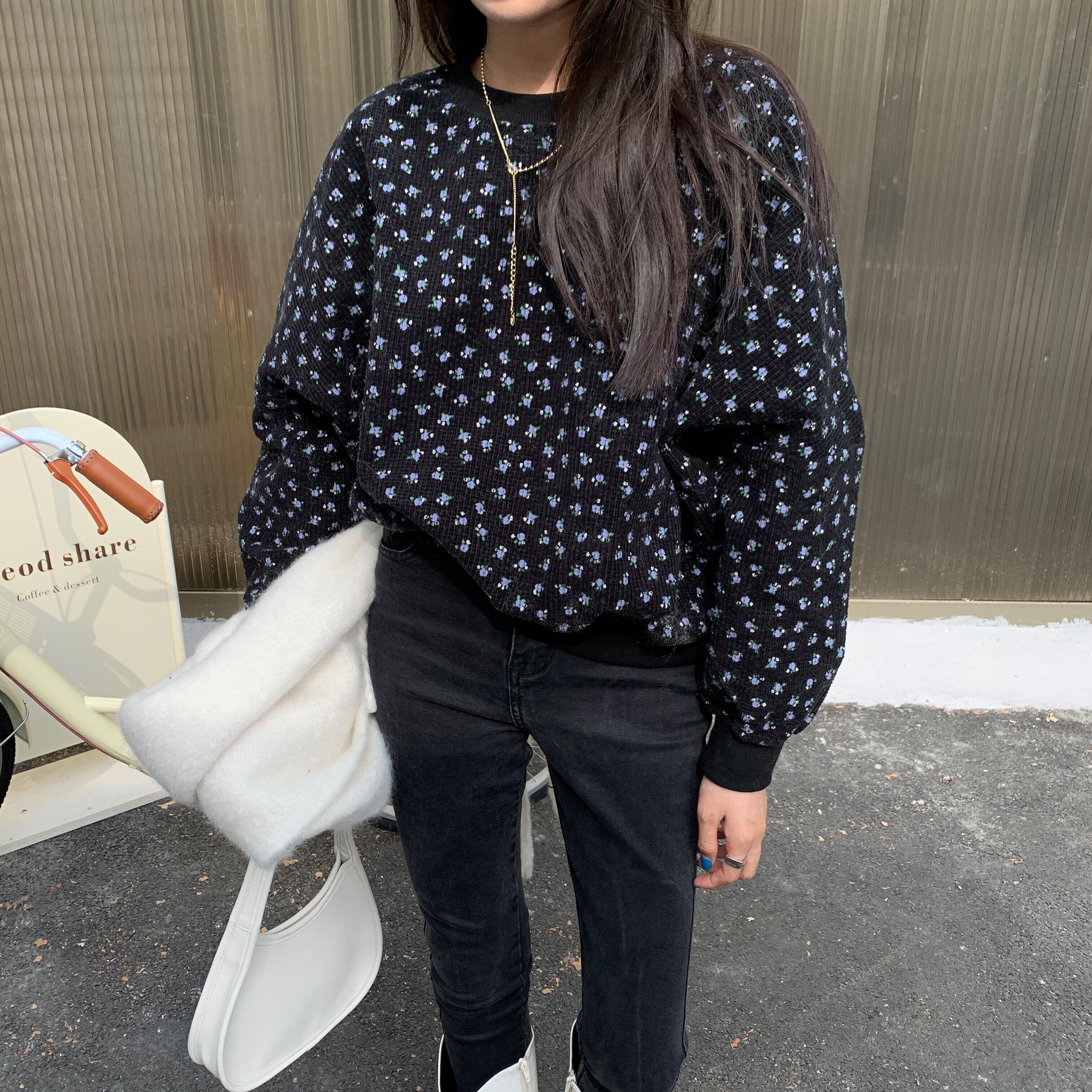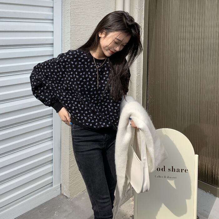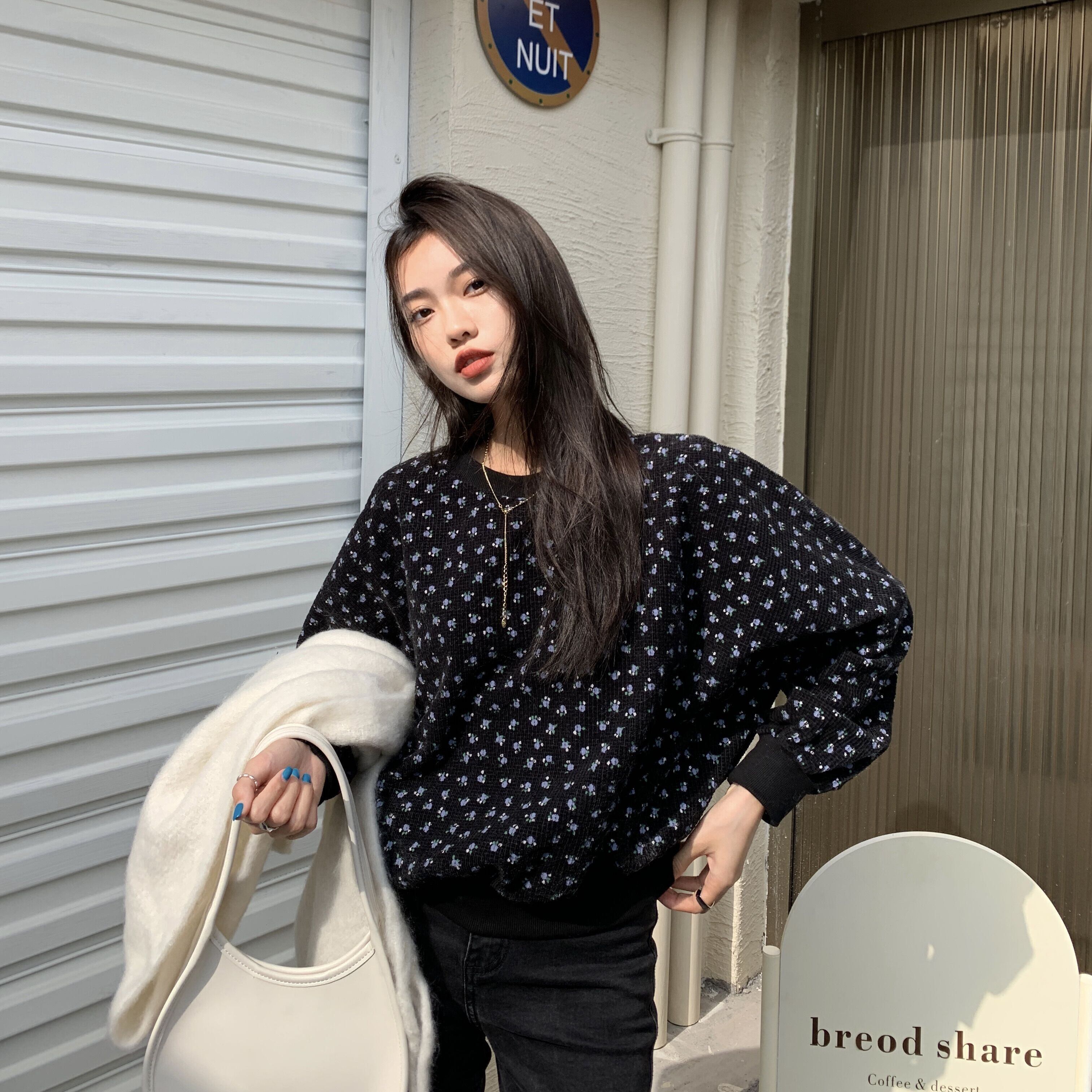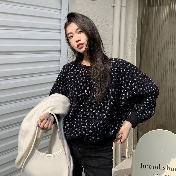 スタンダードブラックフローラルセーター レディースルーズジャケット ショートトップス レトロ 花柄 モンロー1664174318