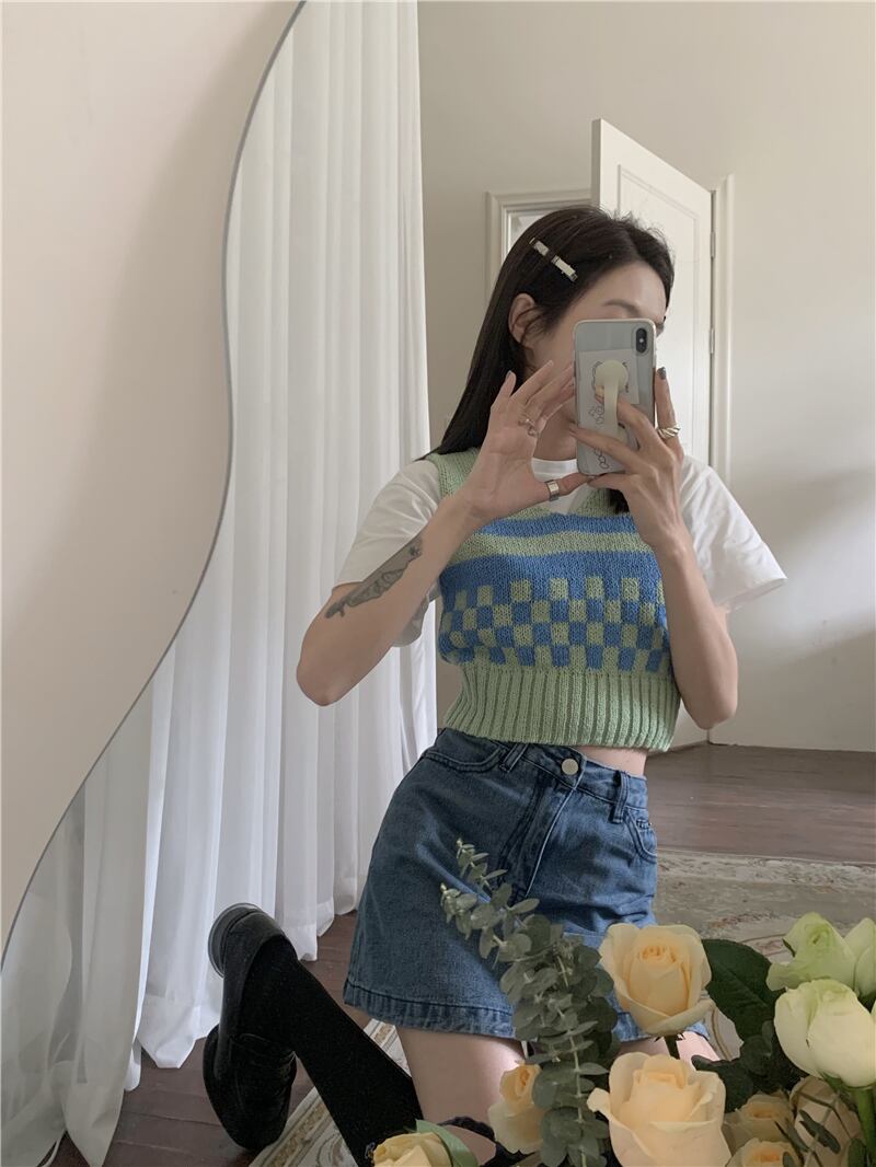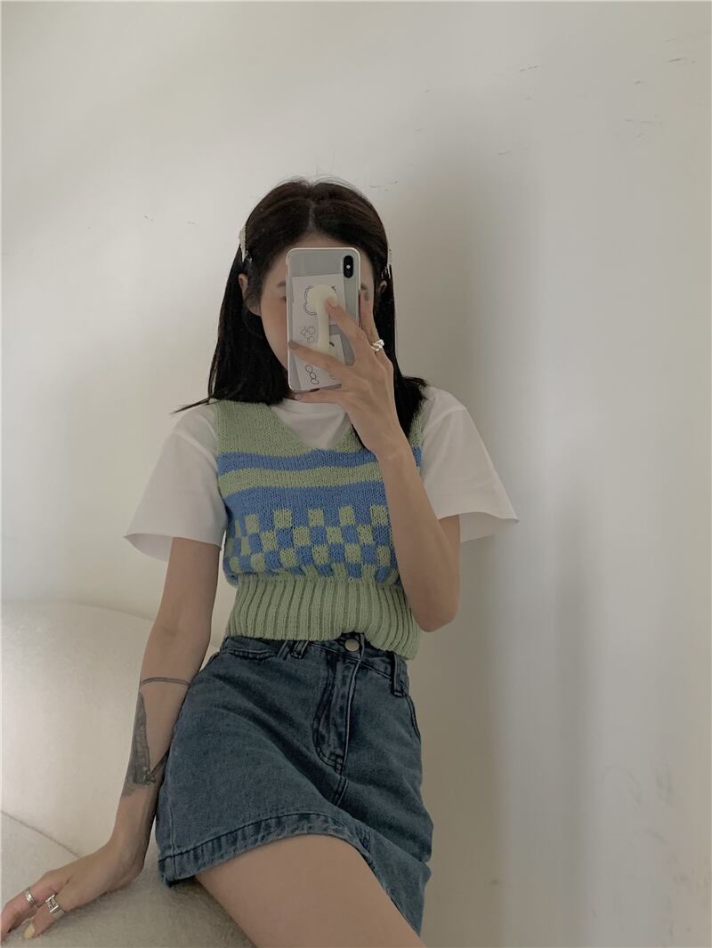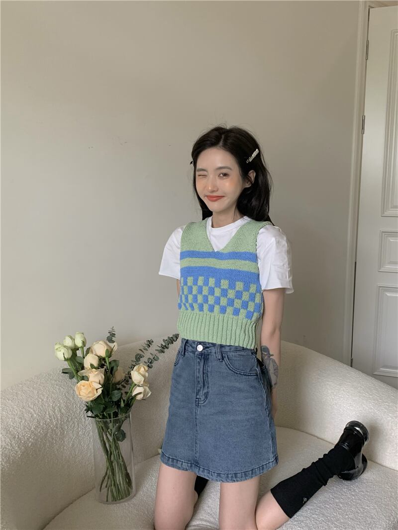 スタンダードニットセーター スタイルVネックショートノースリーブ レトロ 半袖 ハーフスリーブ モンロー85602721221
