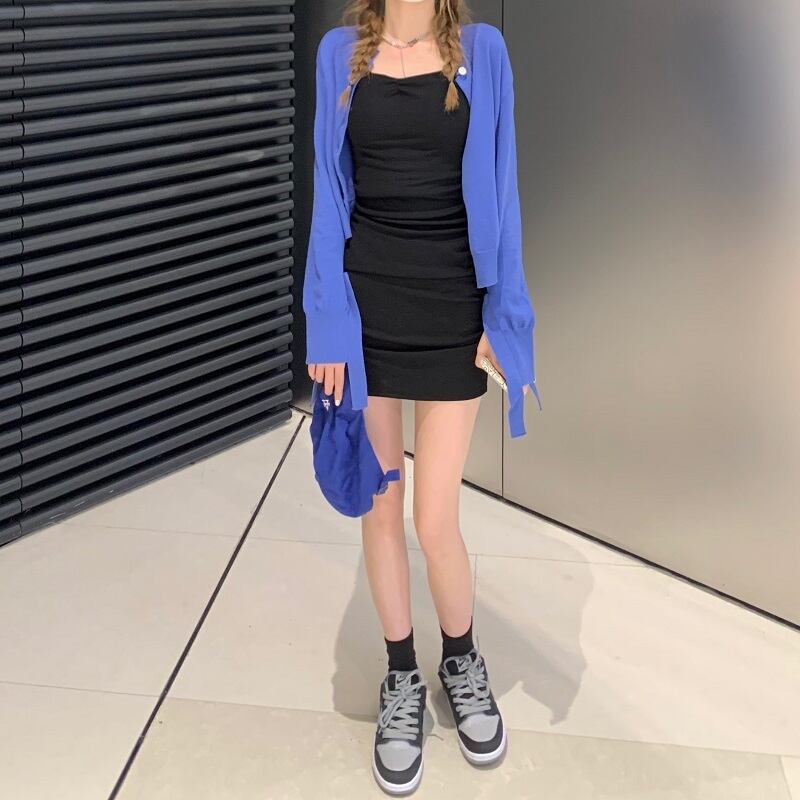 色:ブラックサスペンダースカート,ブルーニットカーディガン