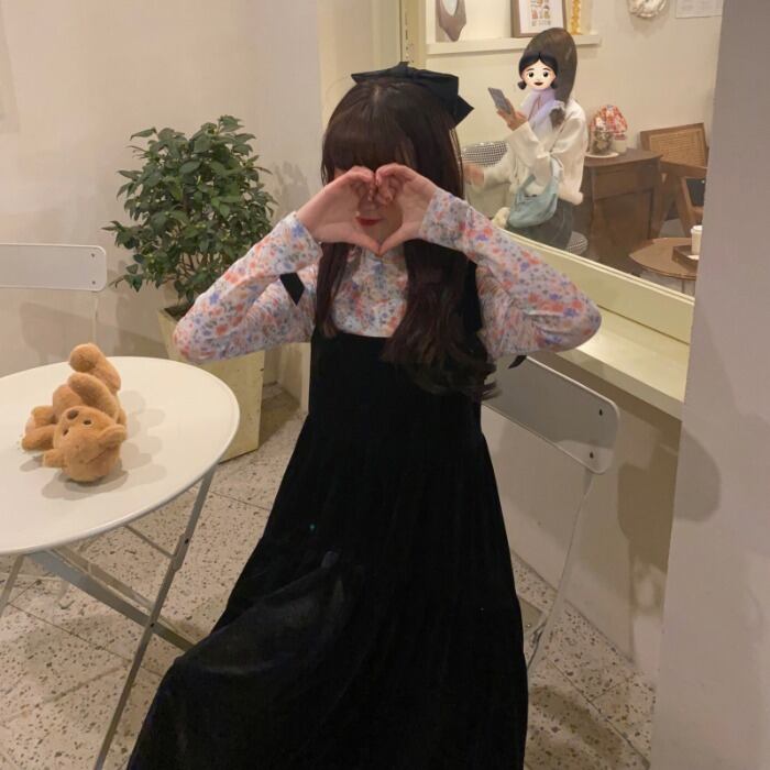 色:ブラックサスペンダースカート,フローラルボトムスシャツ