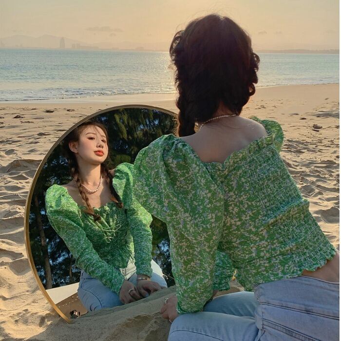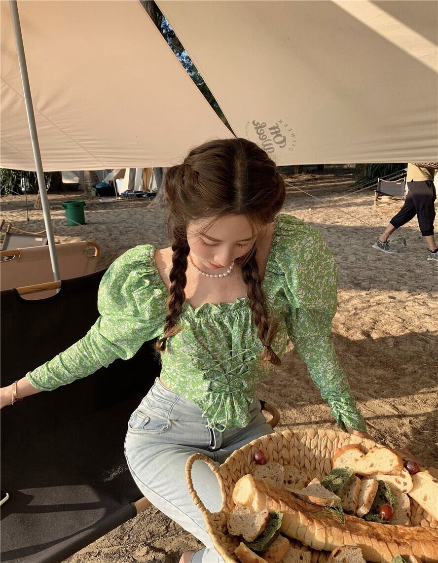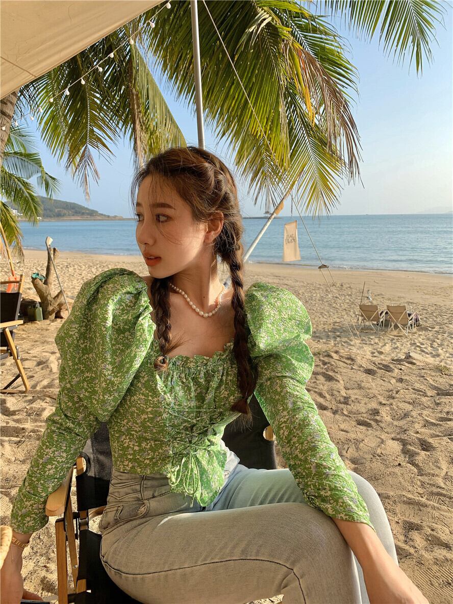 グリーンフローラルシャツ ショートトップス サマースタンダード ロング レトロ 夏物 花柄 モンロー58143489513