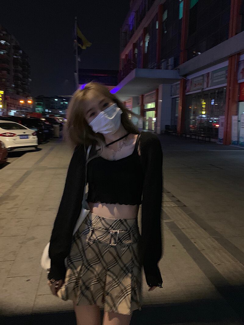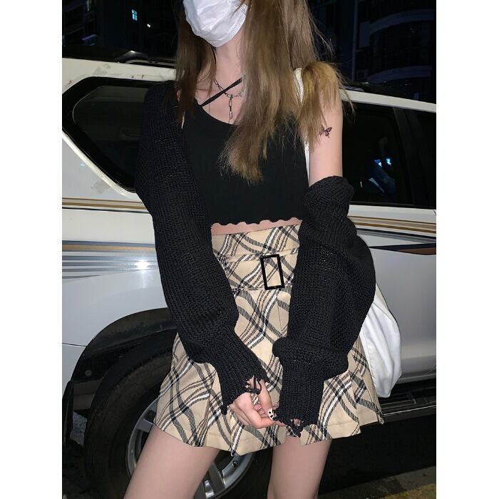 色:カーキプリーツスカート11086,ブラックスリング11088,黒ニットカーディガン3727