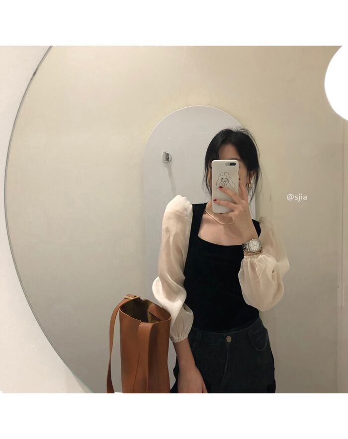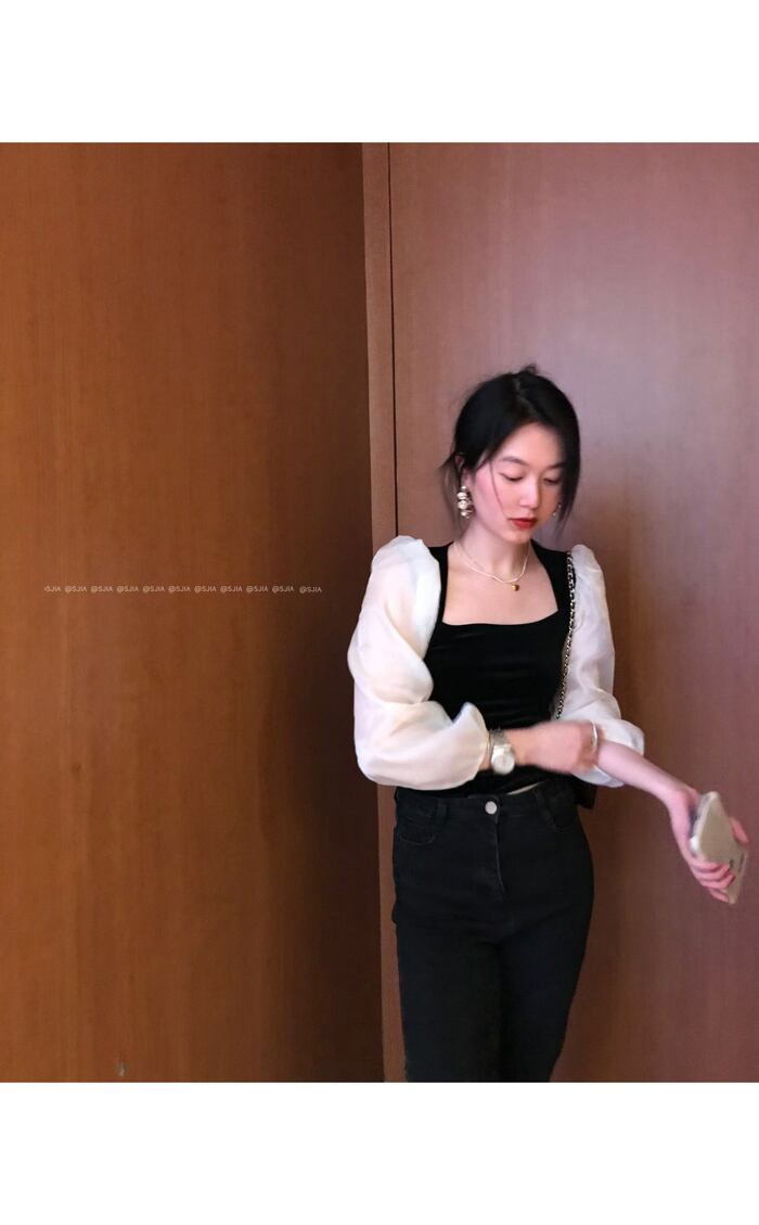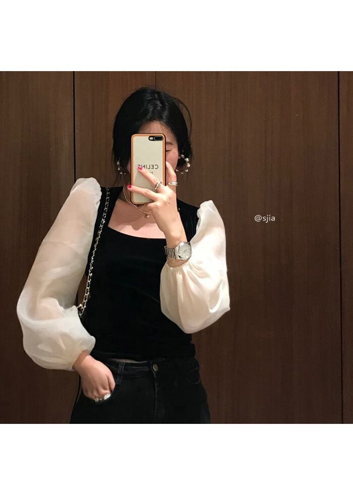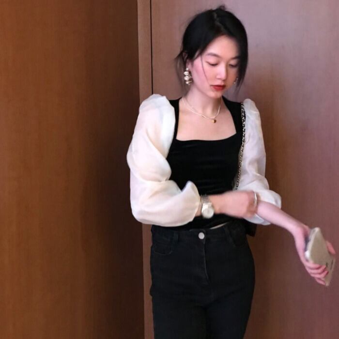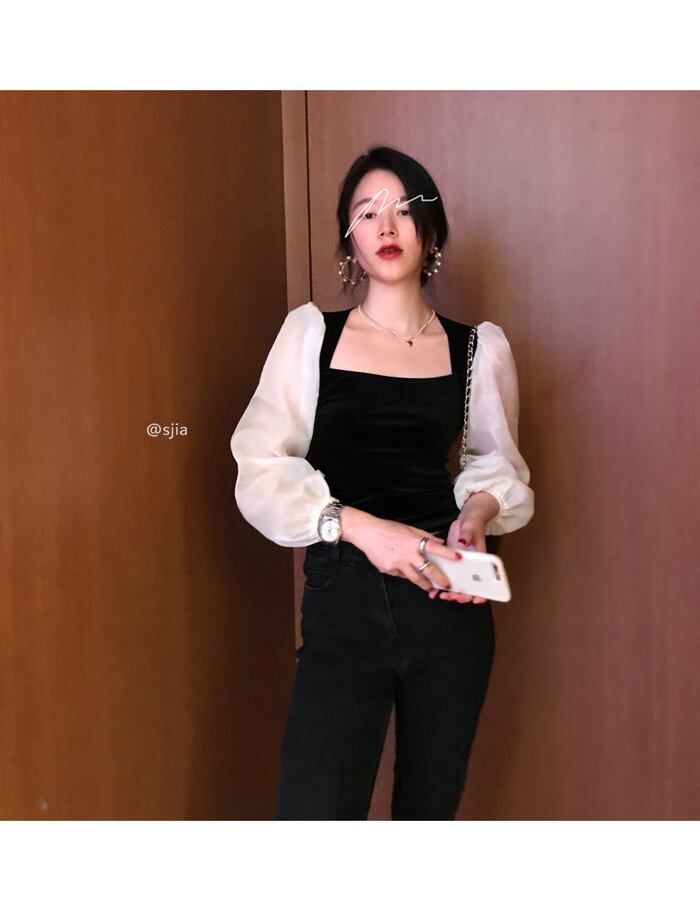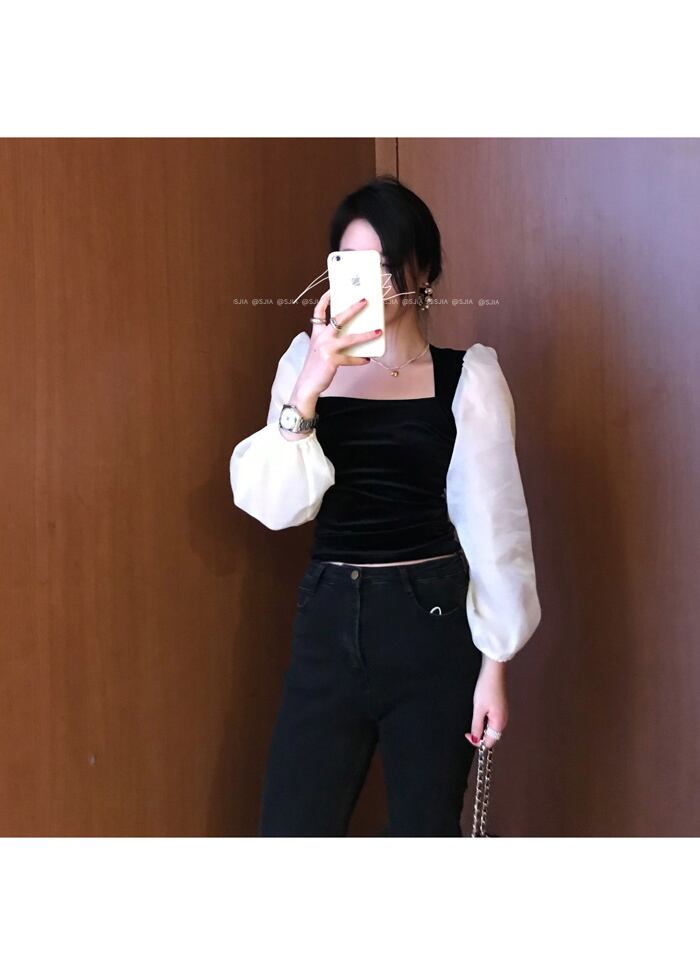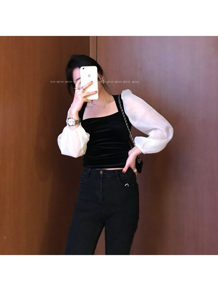 スタンダードスタイルブラックシャツ スプリングショートトップス ロング レトロ 春物 モンロー23966590343