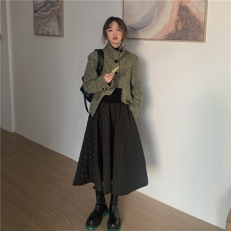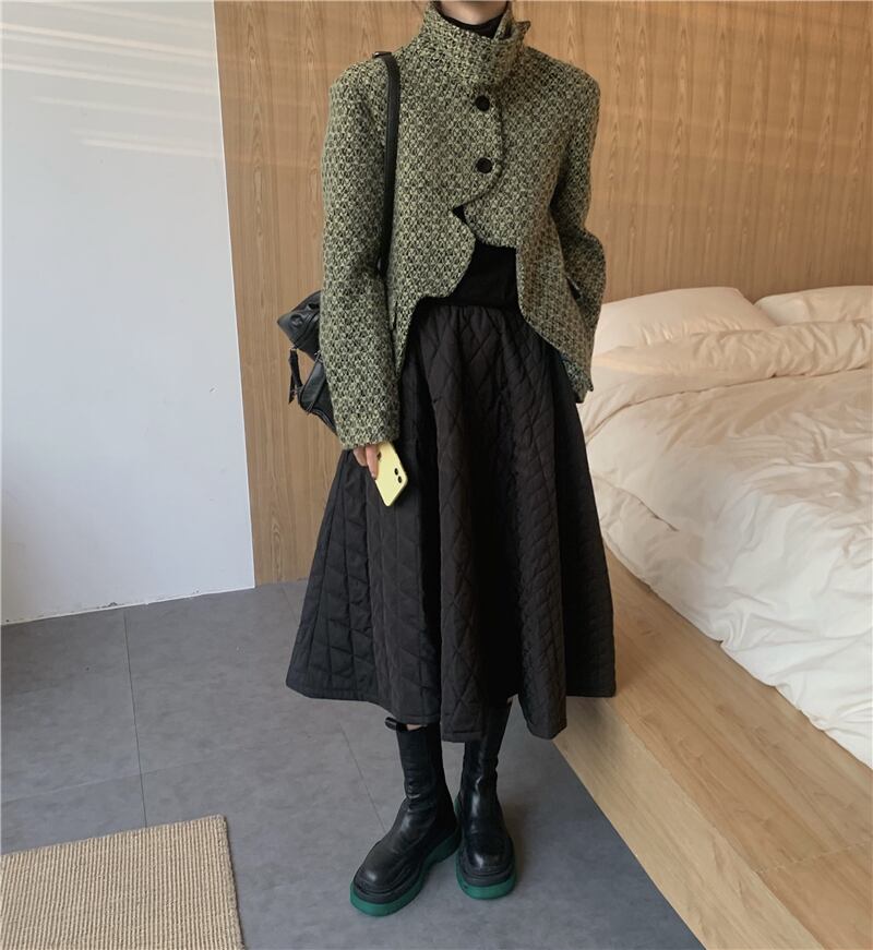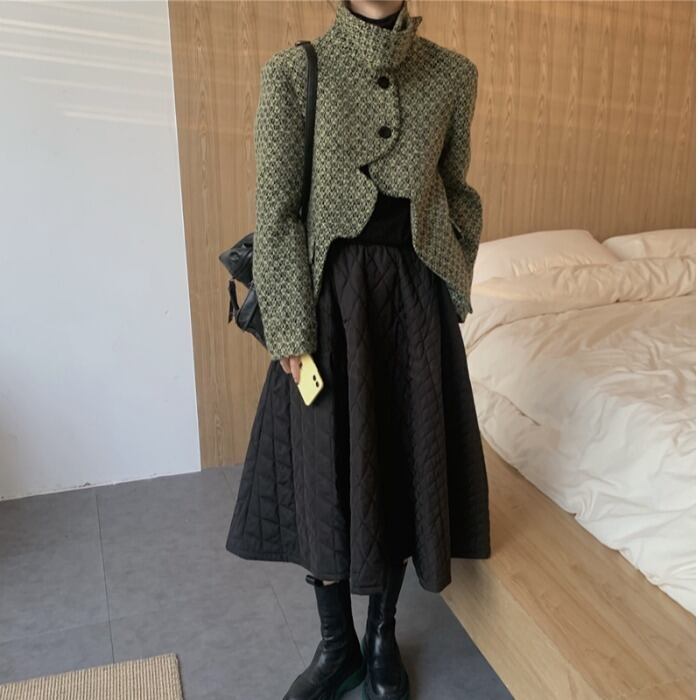 色:グリーンキルティングジャケット,黒のコットンスカート