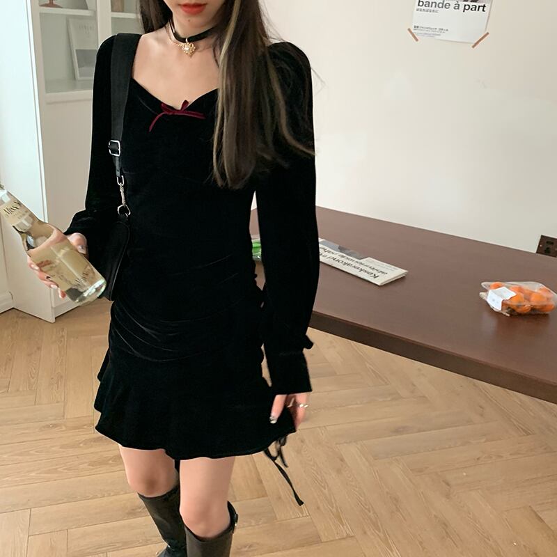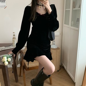 スタンダードベルベットドレス オータムウィンターブラックショートスカート レトロ 秋物 冬物 モンロー8305388211