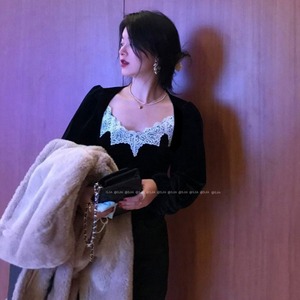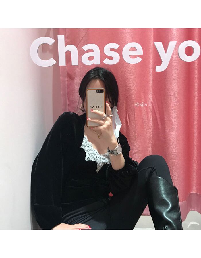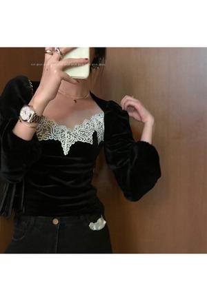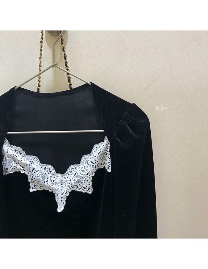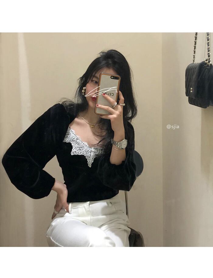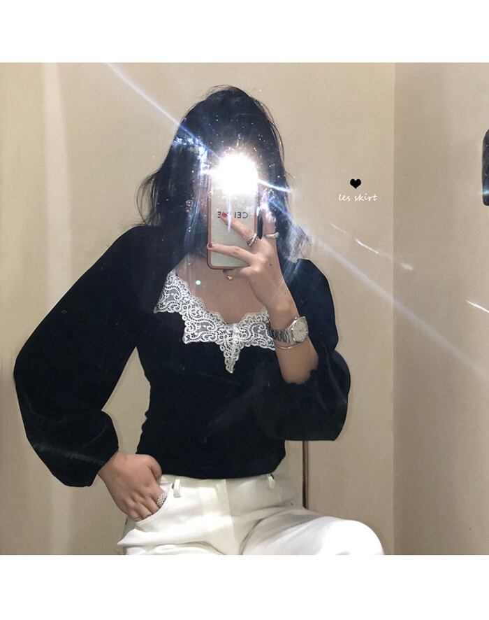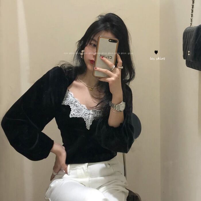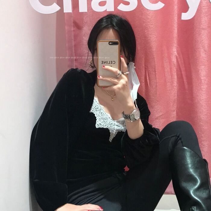 ブラックシャツ レディーススプリングスタンダードベルベットトップス ロング レトロ 春物 モンロー81042134595