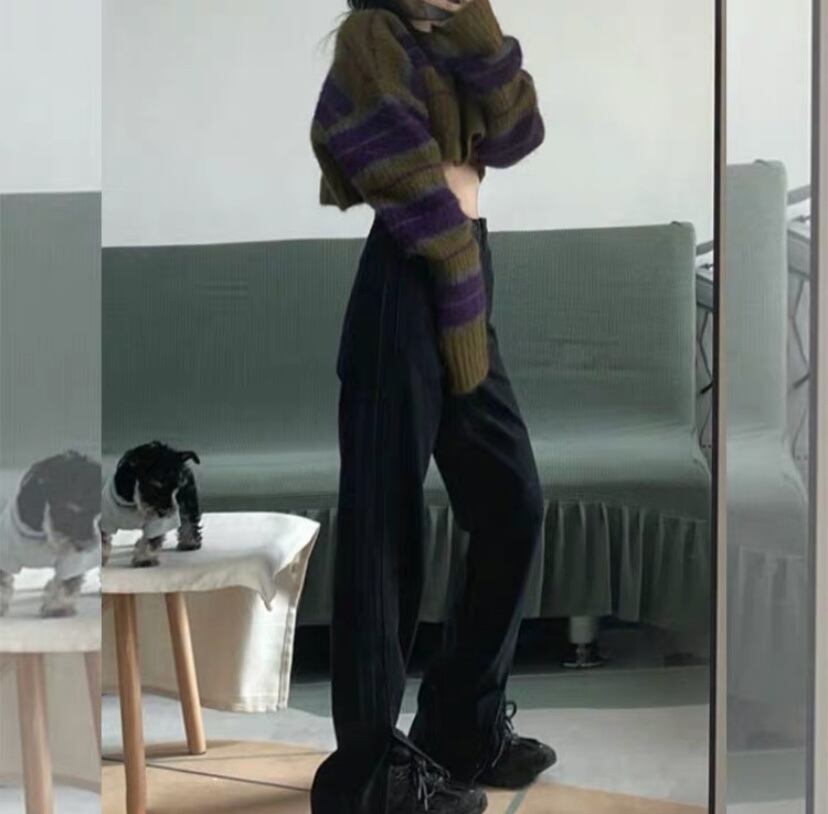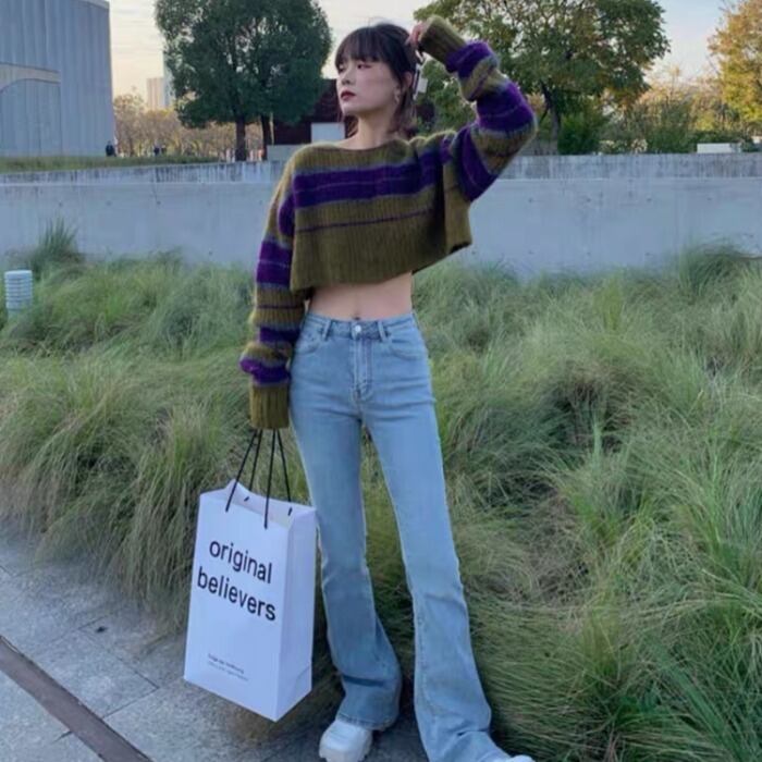 ストライプセーター レディースオータムウィンタールーズスタンダードショートトップス レトロ 秋物 冬物 モンロー66773507157