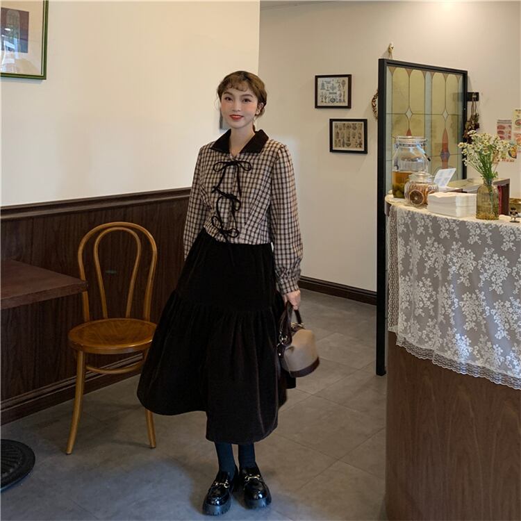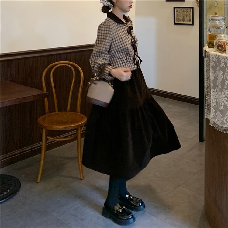 色:黒いシャツ,茶色の赤いスカート,黒スカート