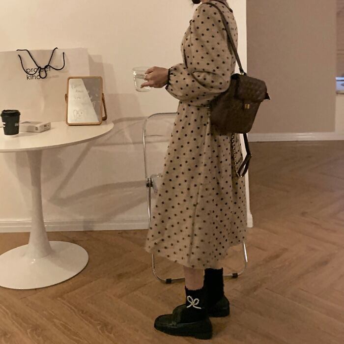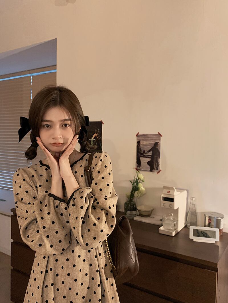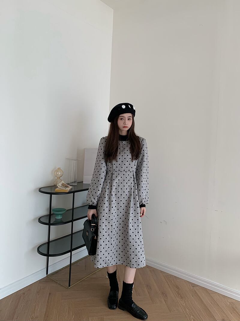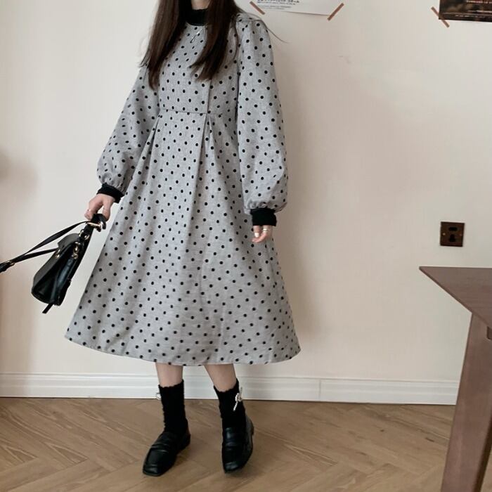 スタンダード水玉ドレス ロングスカート Aラインオータムウィンター薄手 レトロ 秋物 冬物 モンロー91273030896
