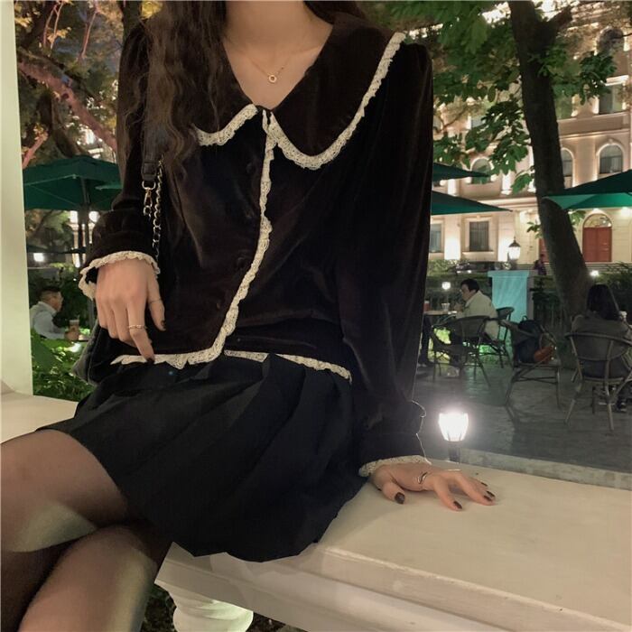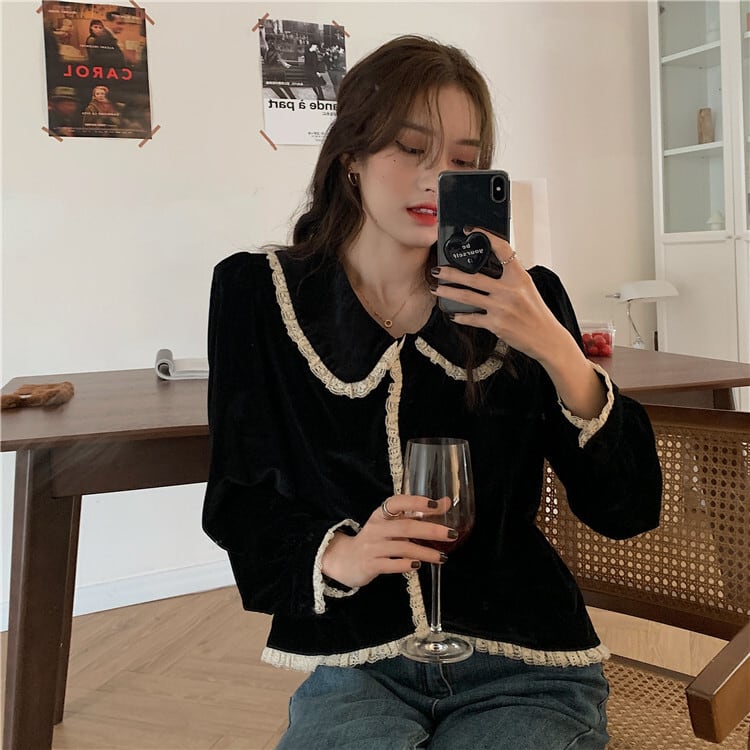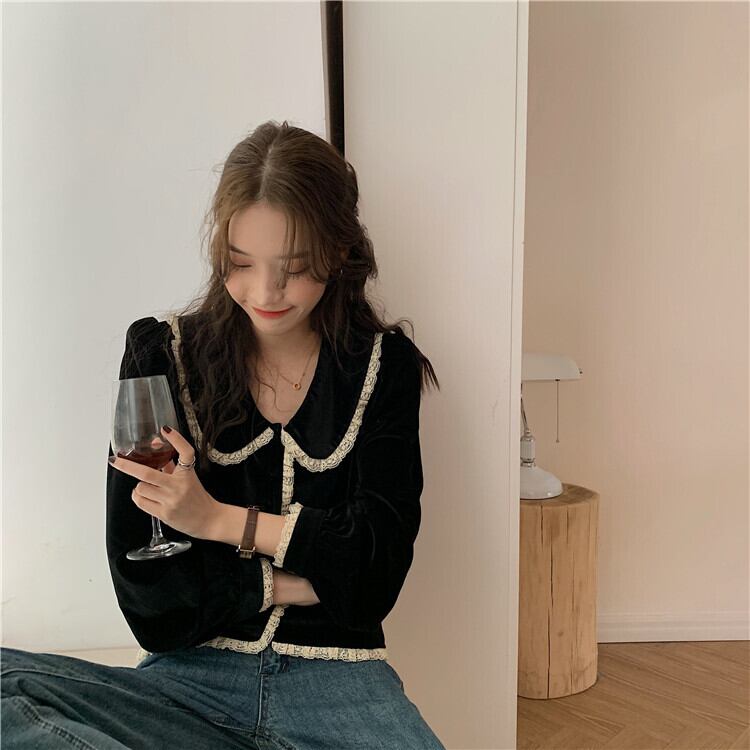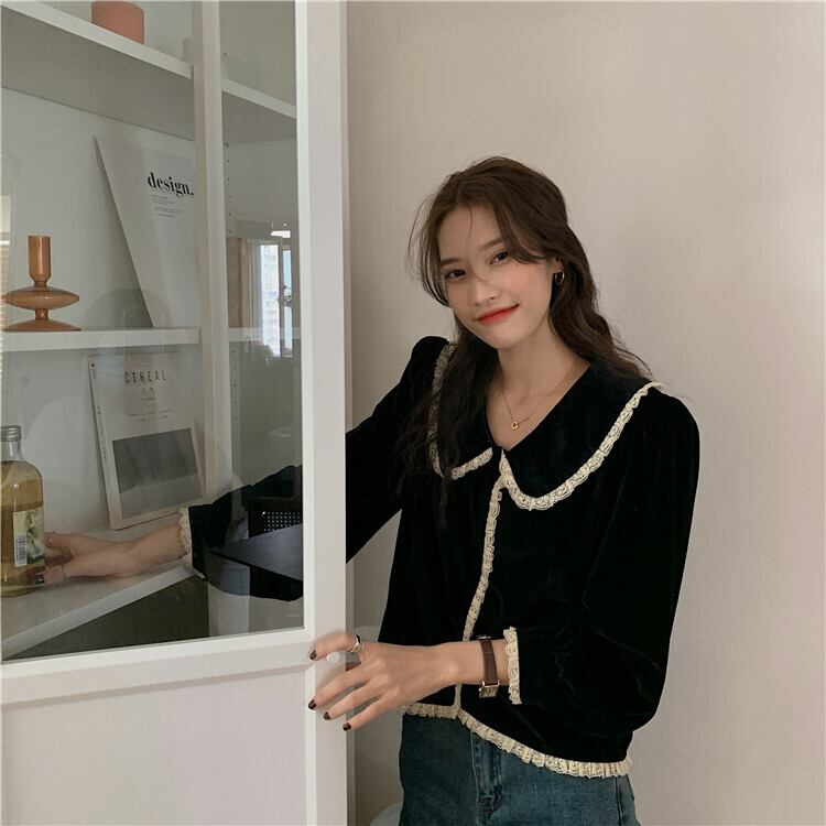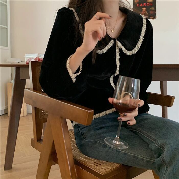 ベルベットブラックシャツ スプリングスタイルスタンダードカラートップス コート ロング レトロ 春物 モンロー56206944554