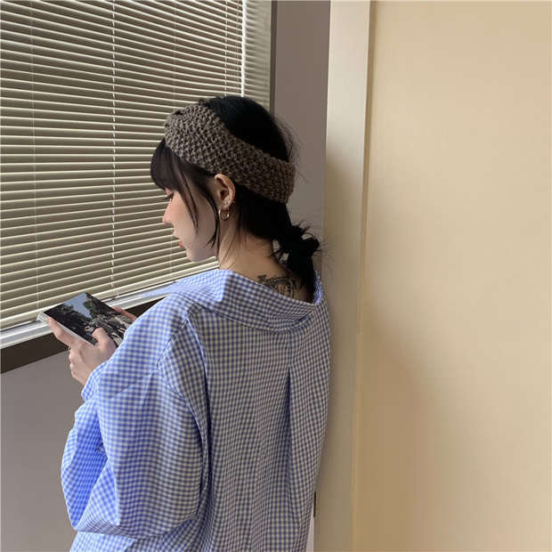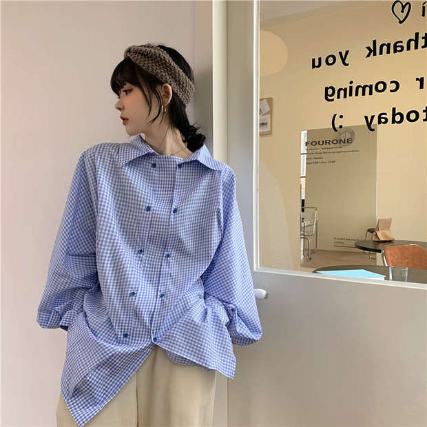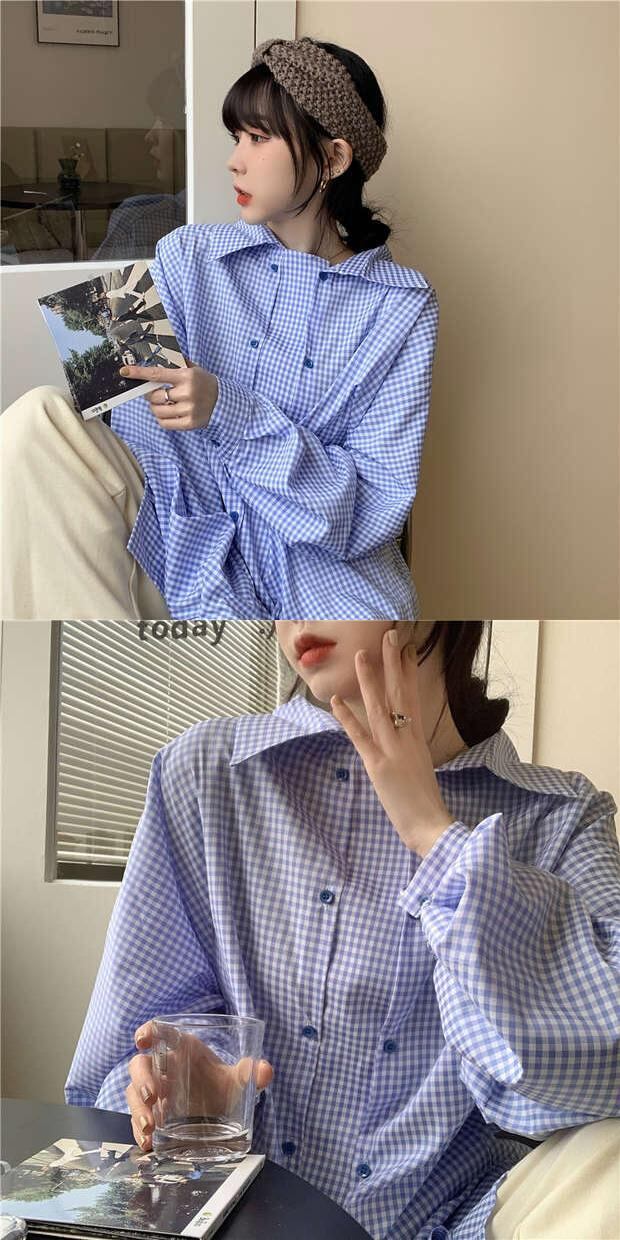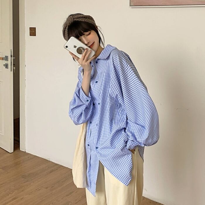 ブルー格子柄シャツ レディースオータムウィンタージャケット トップス ロング 秋物 冬物 モンロー82280619040