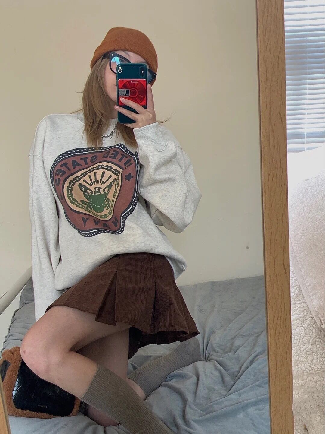 色:レトロなバッジとベルベットのスウェットシャツ,茶色のスカート