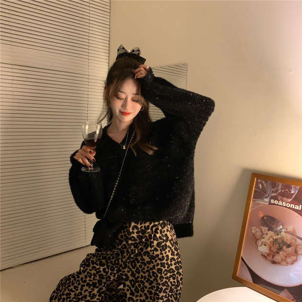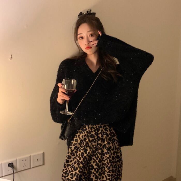 ブラックVネックセーター スプリングスタイルニットルーズトップス 春物 モンロー20933600005