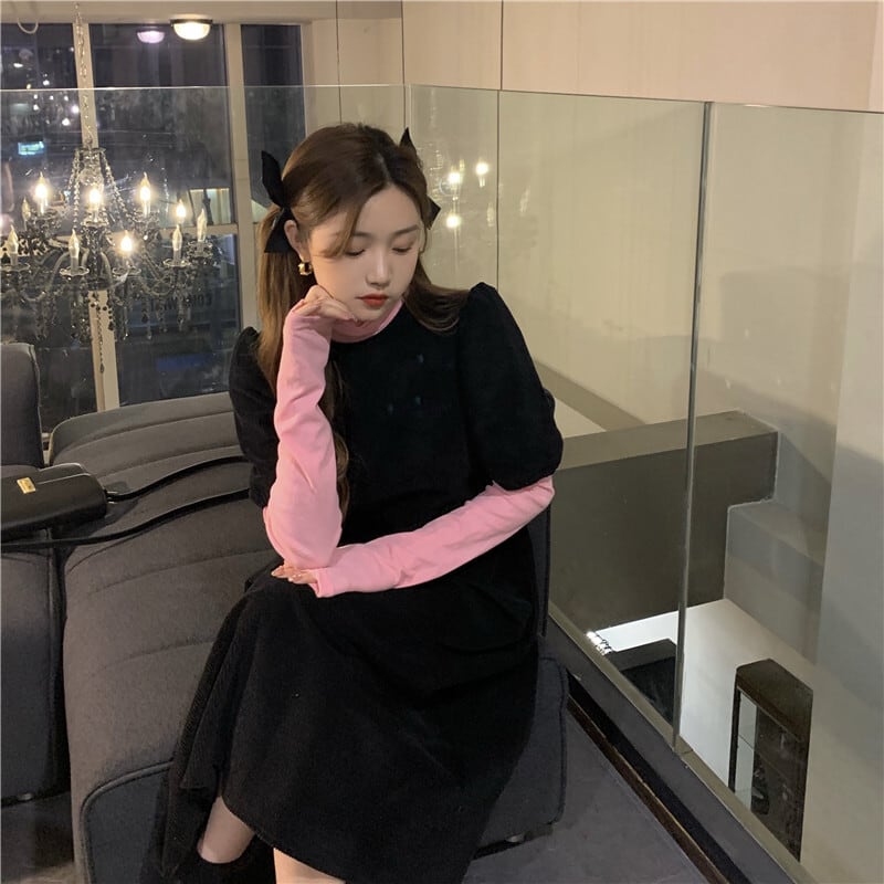 色:黒いドレス,青い服,白いレース,ピンクベース