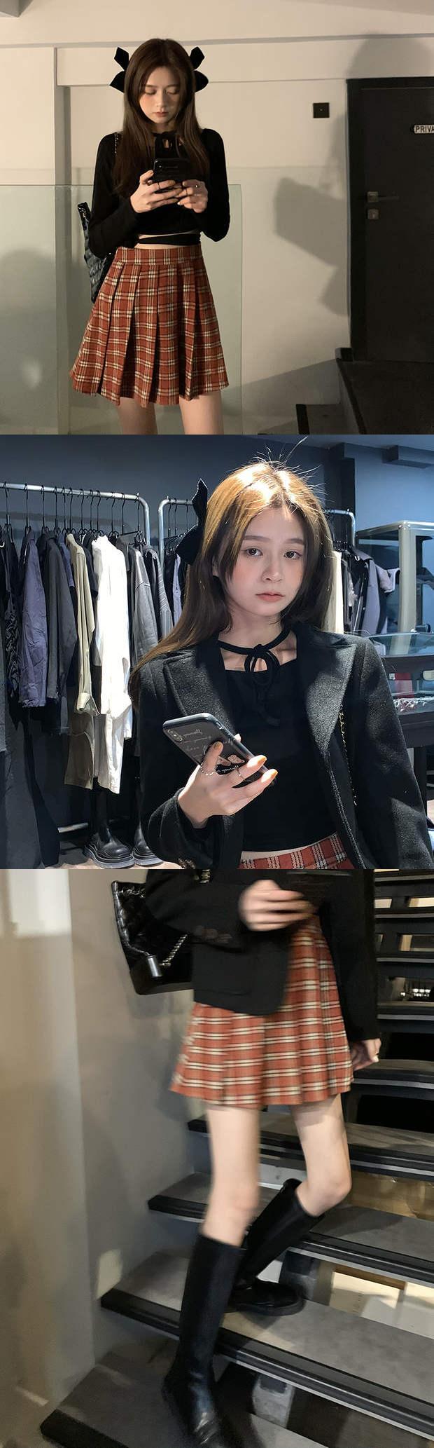 色:黒のコート10922,カーキコート10922,赤いチェックスカート10938,カーキスカート10938,黒のボトミングシャツ10950