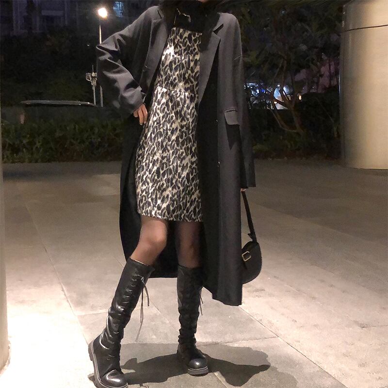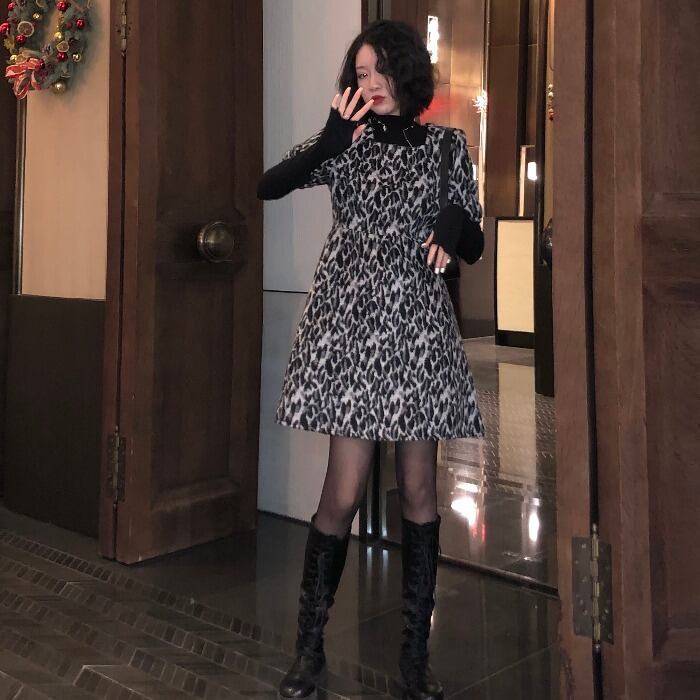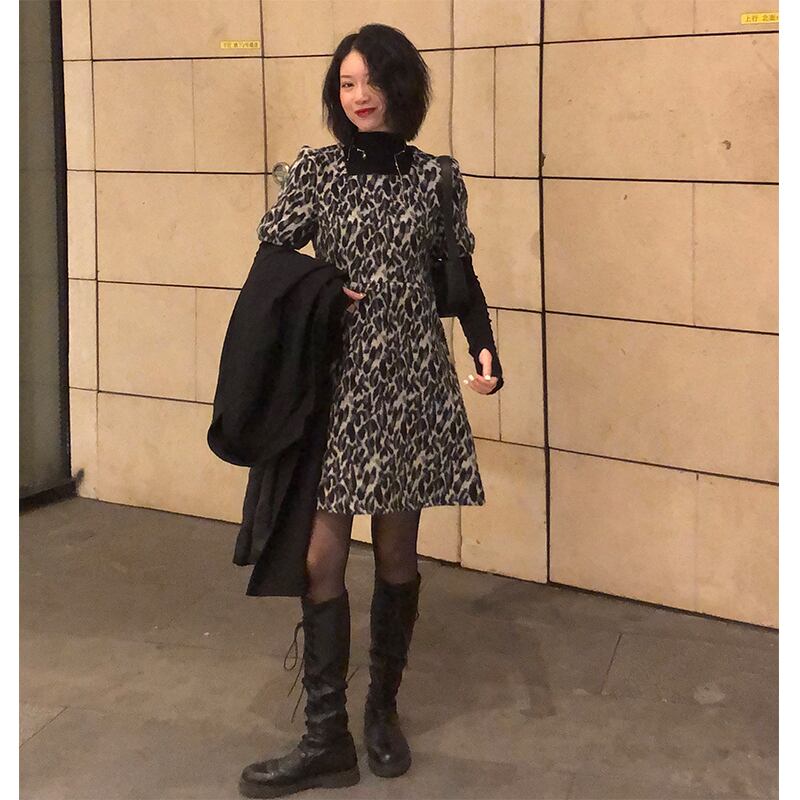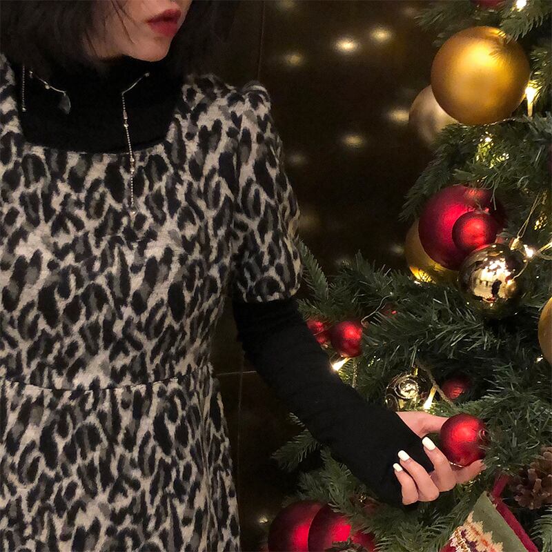レオパードプリント柄ドレス オータムウィンターAラインスカート ウェスト薄手ショート 秋物 冬物 モンロー70511476700