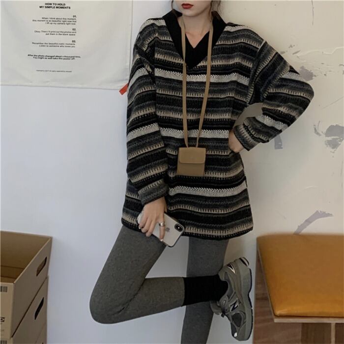ストライプVネックセーター ルーズスタンダードオータムウィンタートップス レトロ 秋物 冬物 モンロー94315872821