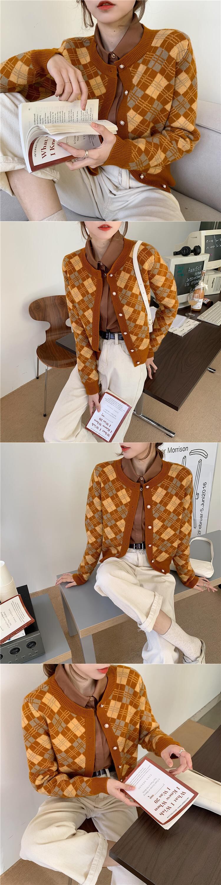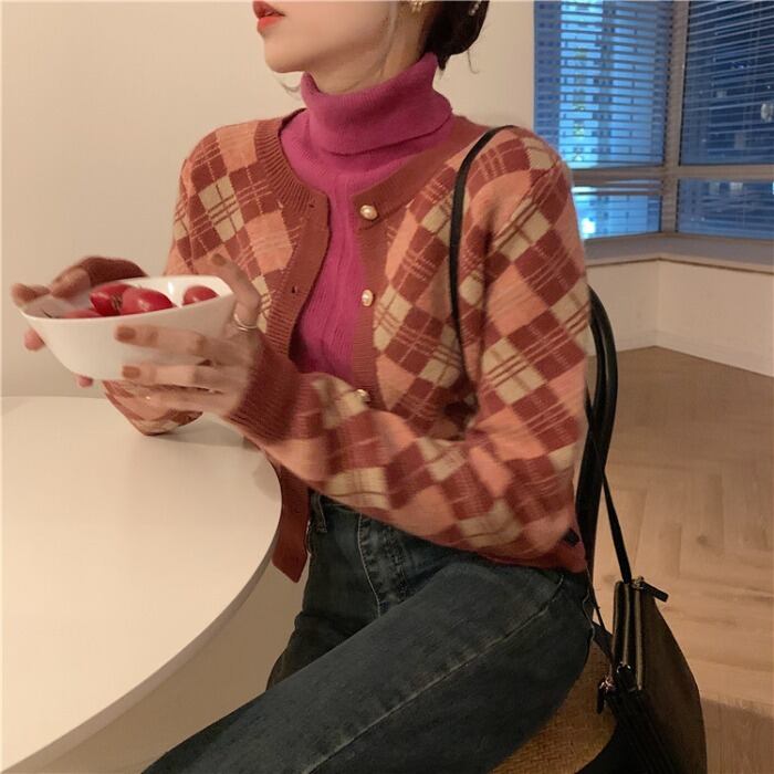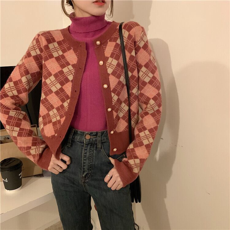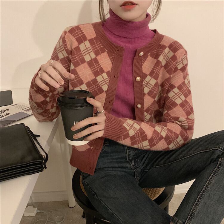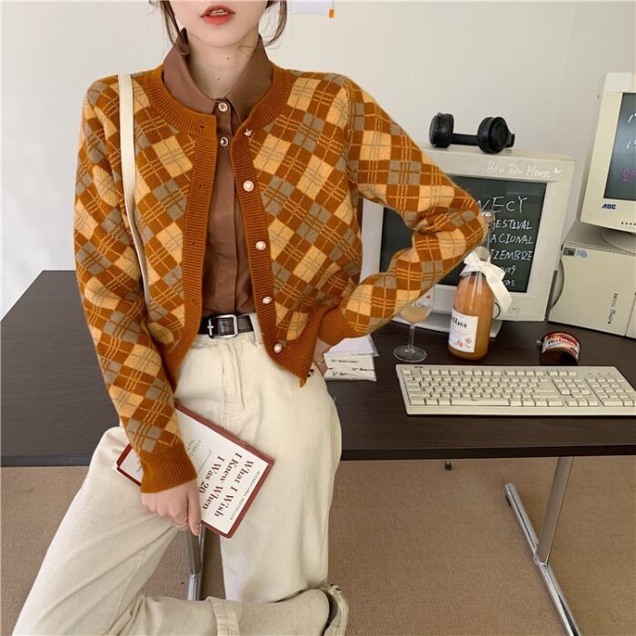 格子柄カーディガンセーター ルーズニットジャケット ウィンタースタンダードショートトップス レトロ 冬物 モンロー78087895617