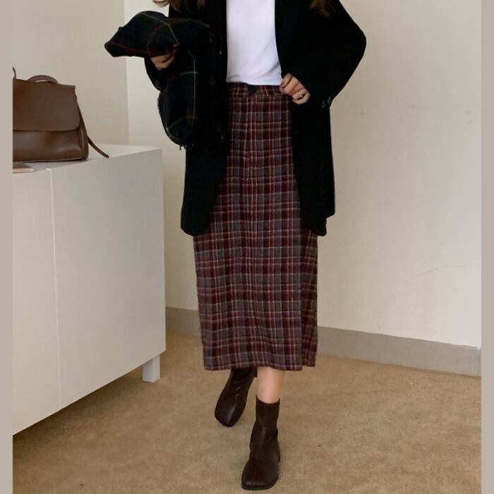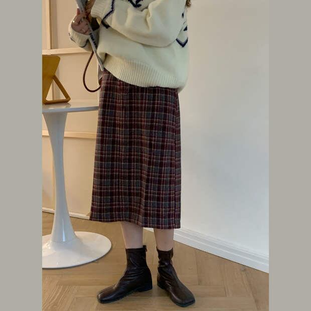 ウェスト格子柄スカート Aラインウィンターセーター ロング 冬物 モンロー13241952852