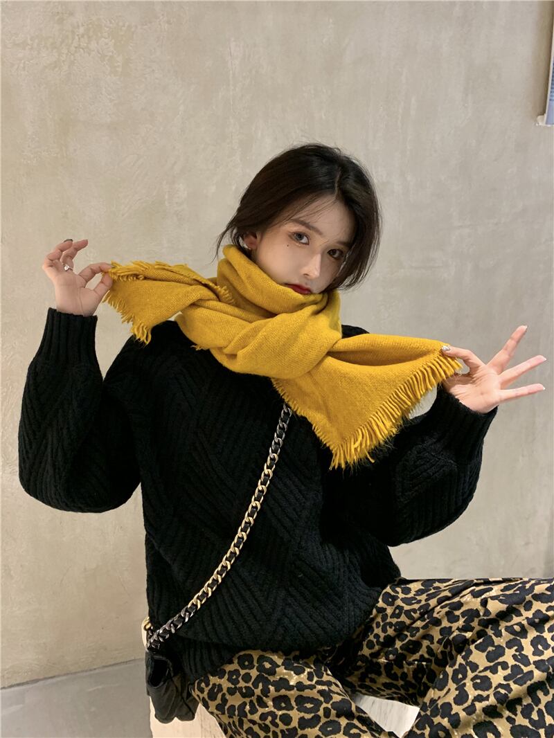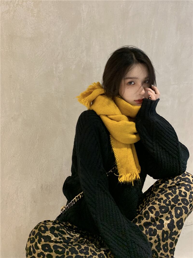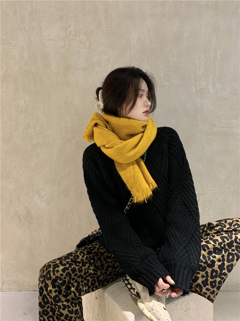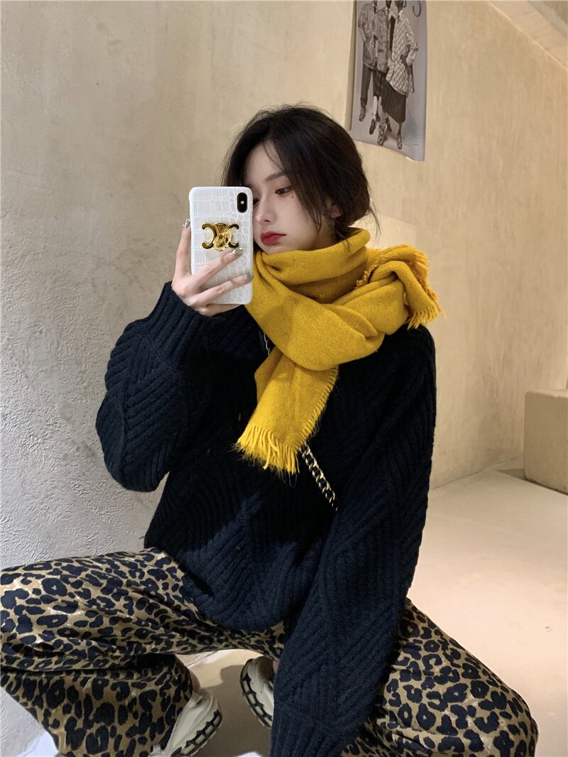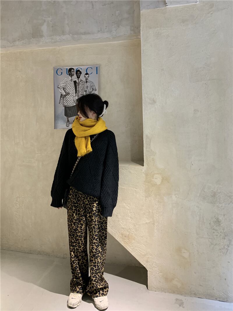 色:黒いセーター,ヒョウ柄パンツ
