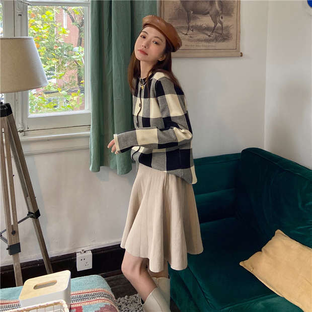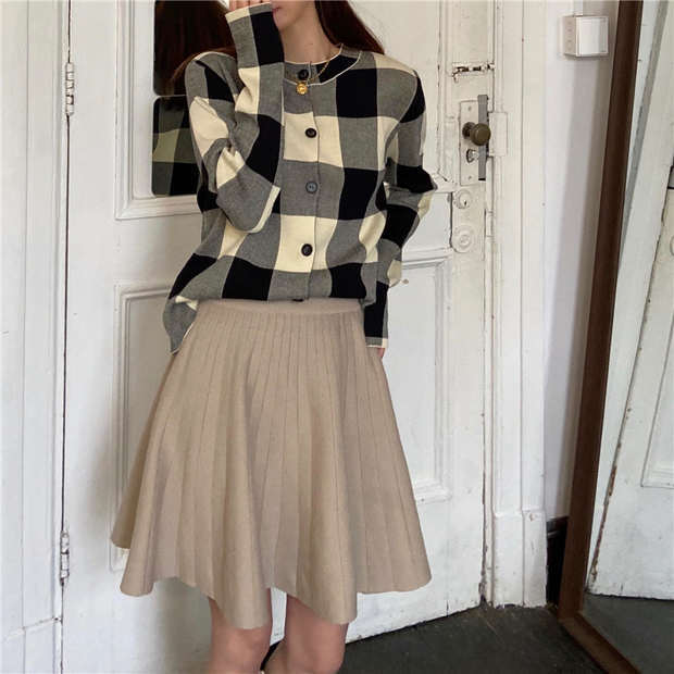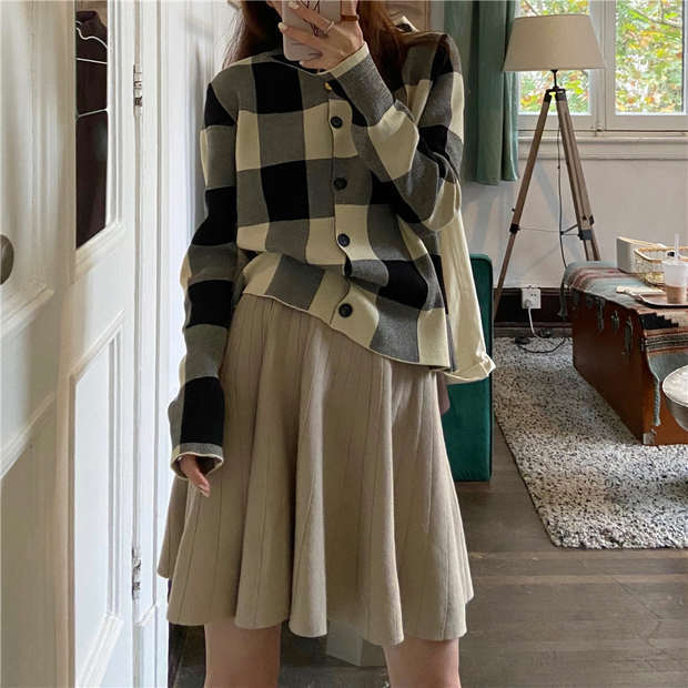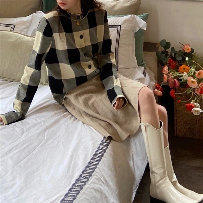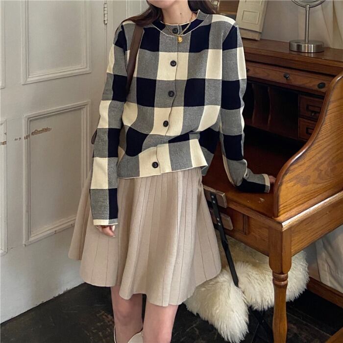 スプリングウィンタースタンダード格子柄セーター コート ルーズショートカーディガントップス ロング レトロ 春物 冬物 モンロー95211952824