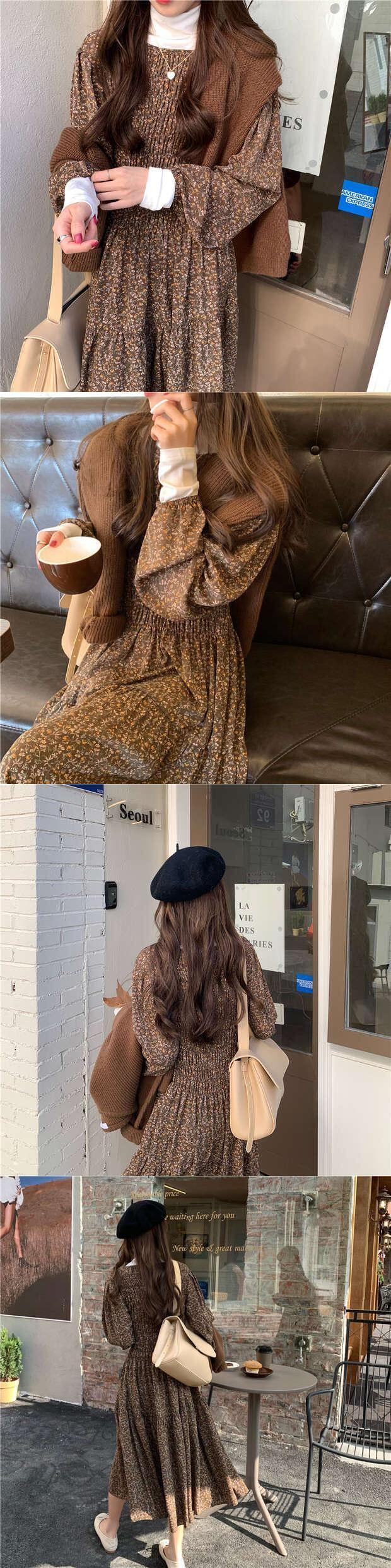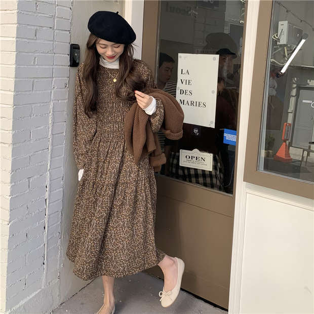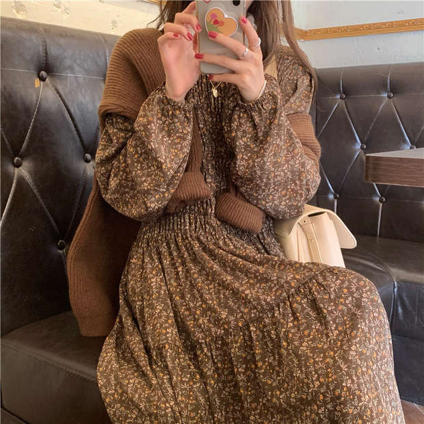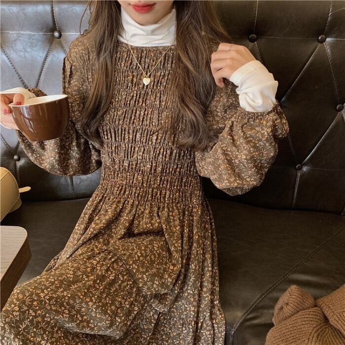 スタンダードルーズフローラルドレス オータムウィンタースカート ロング レトロ 秋物 冬物 花柄 モンロー66204613627