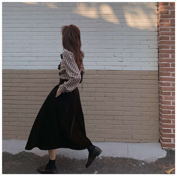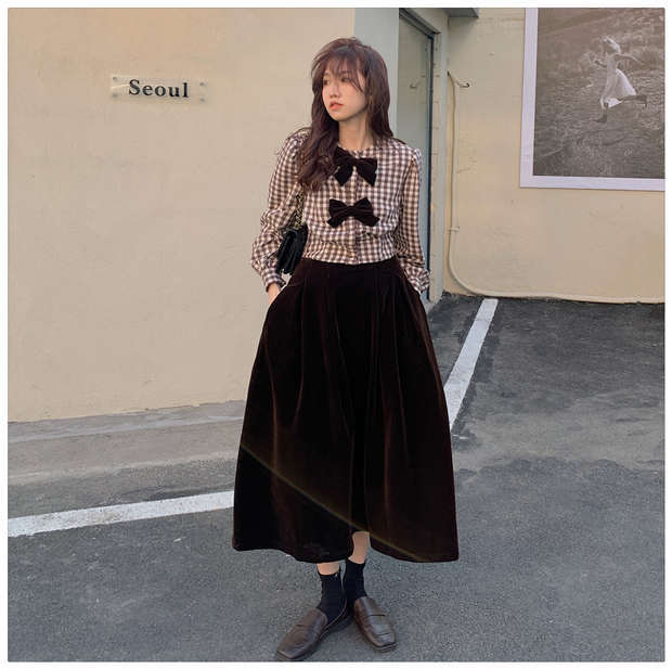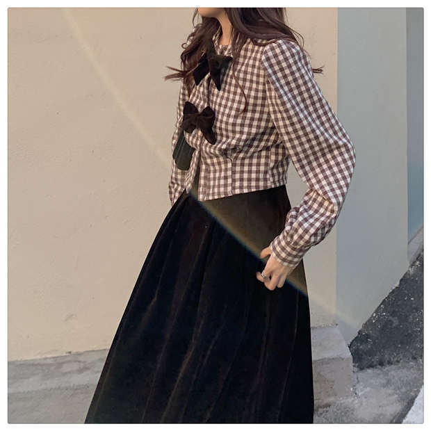 色:チェック柄トップ,コーヒー色のスカート