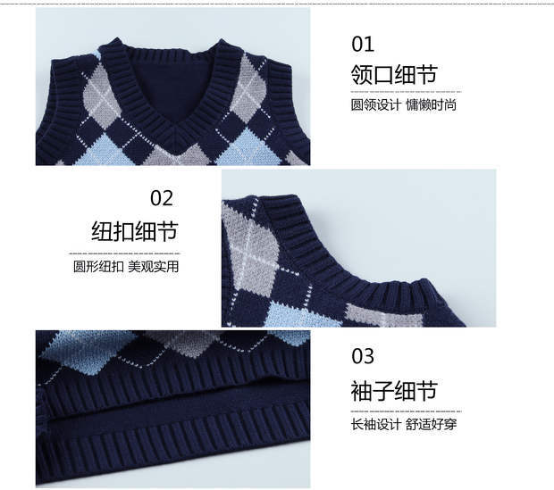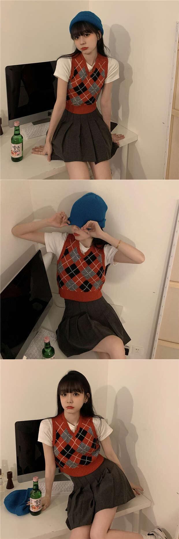 Vネック格子柄ニットオータムウィンターショートセーター スタイルノースリーブトップス 秋物 冬物 モンロー65339436588