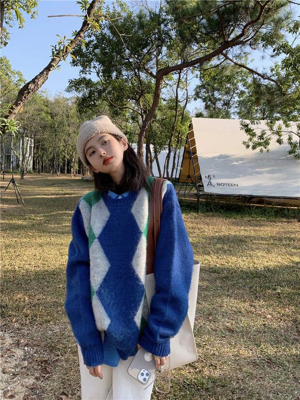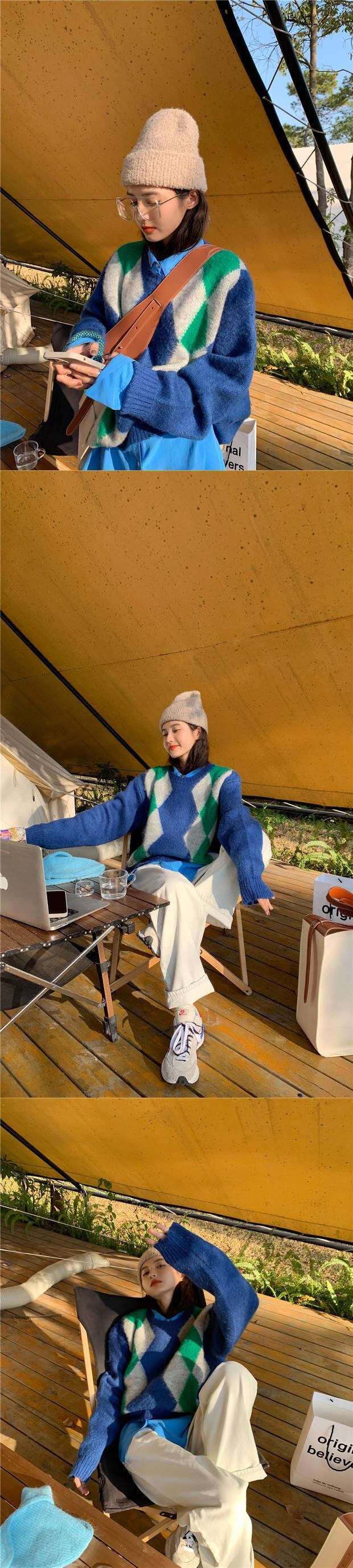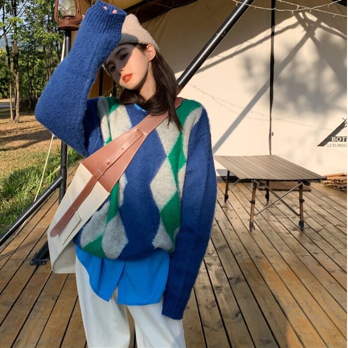 プルオーバー 格子柄セーター スプリングウィンタールーズニットトップス コート 春物 冬物 モンロー36157443042