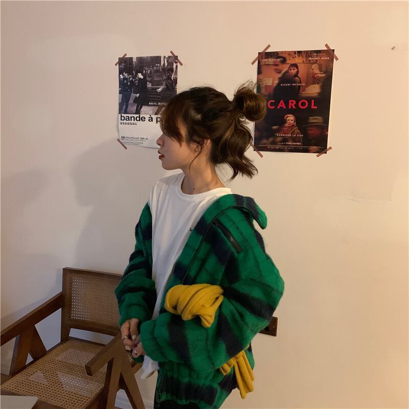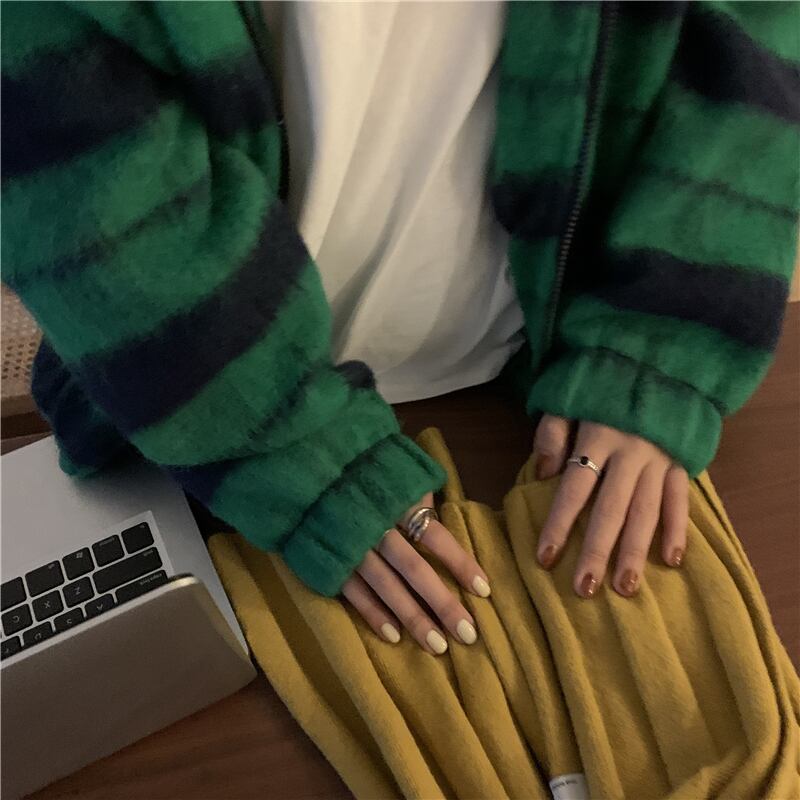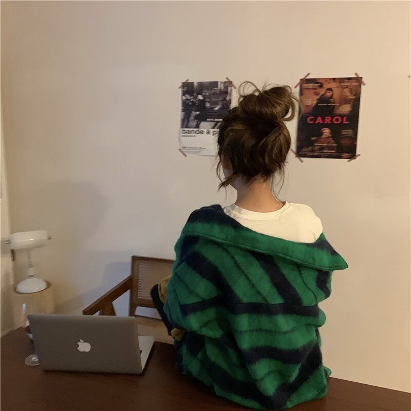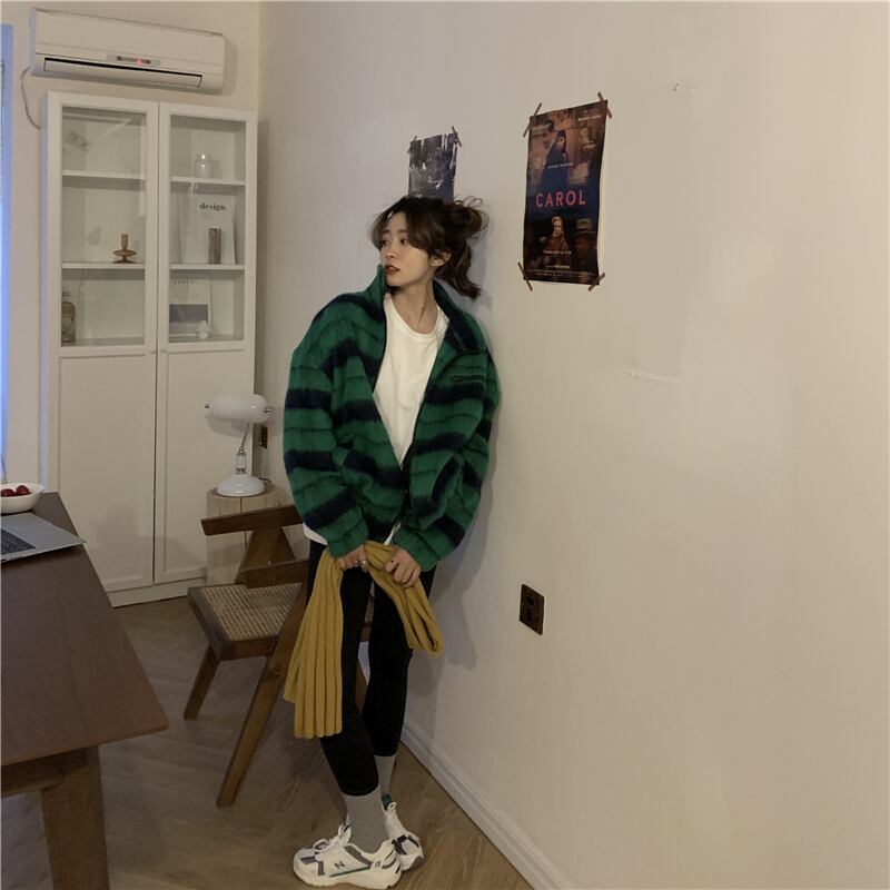 グリーンストライプカーディガンセーター レディースルーズオータムウィンターニットトップス コート ロング 秋物 冬物 モンロー98201816525
