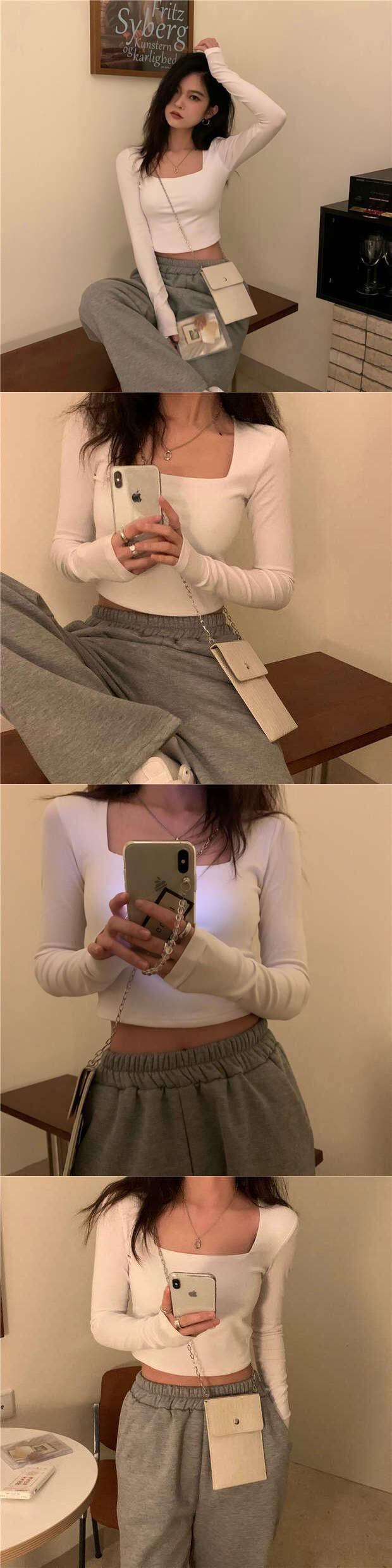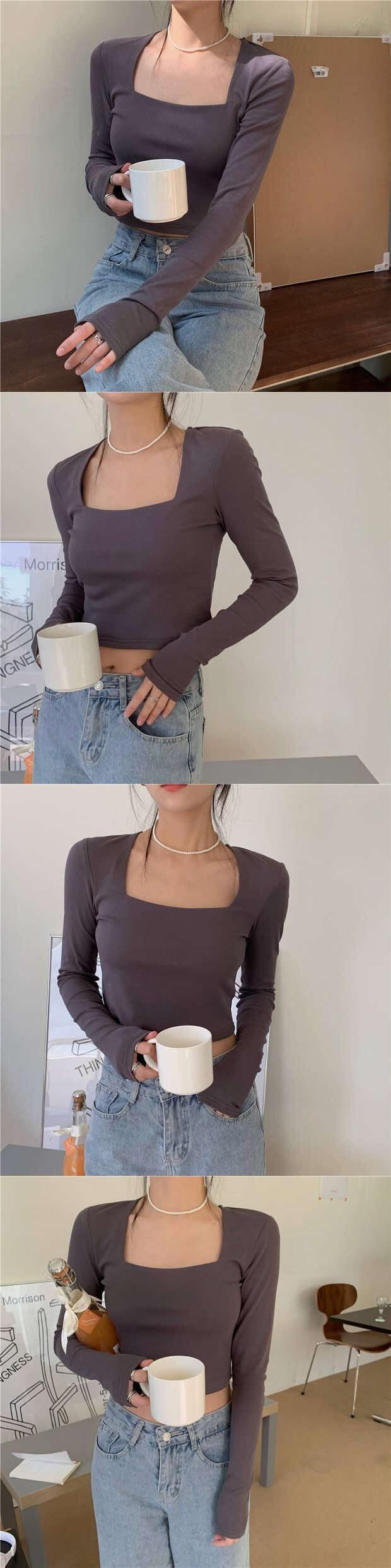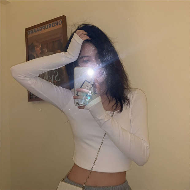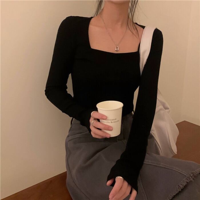 ブラックTシャツ シャツ スタンダードオータムウィンタースリムショートトップス ロング レトロ 秋物 冬物 スクウェア モンロー90166678461