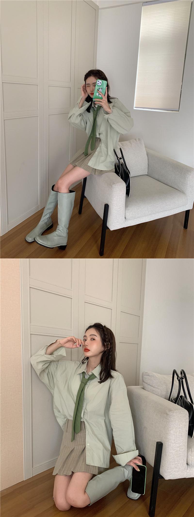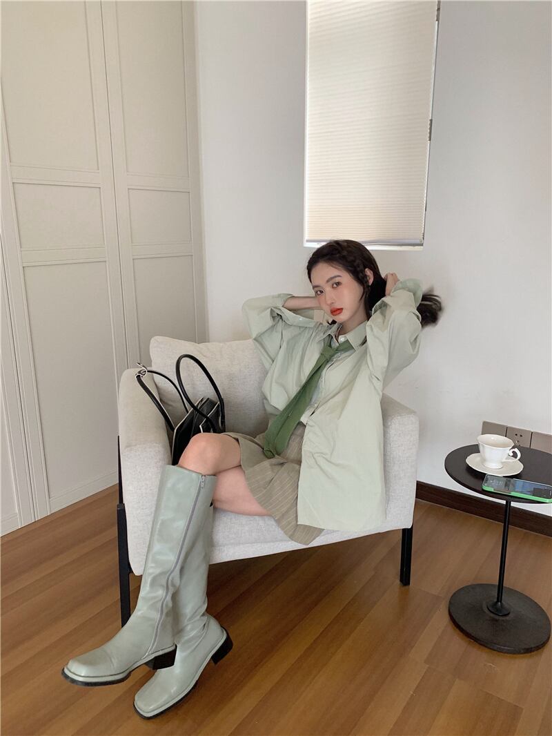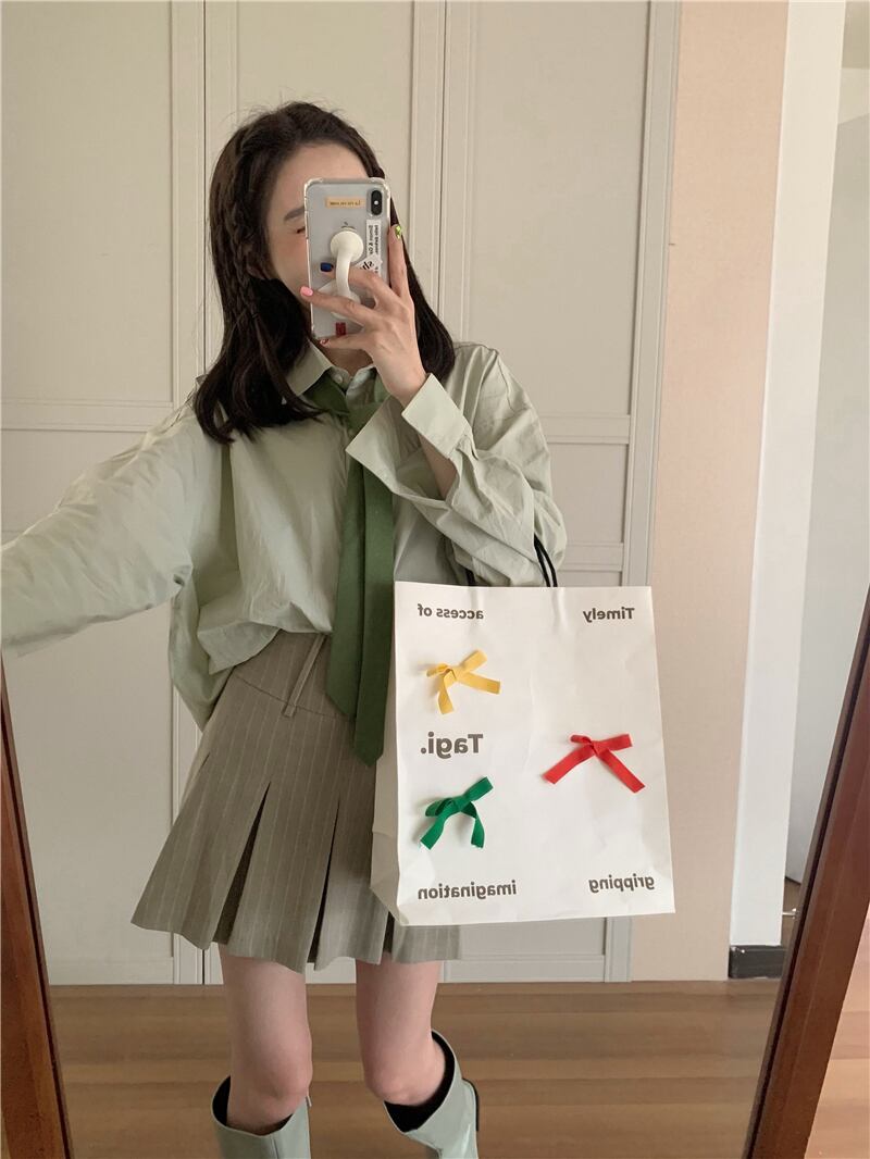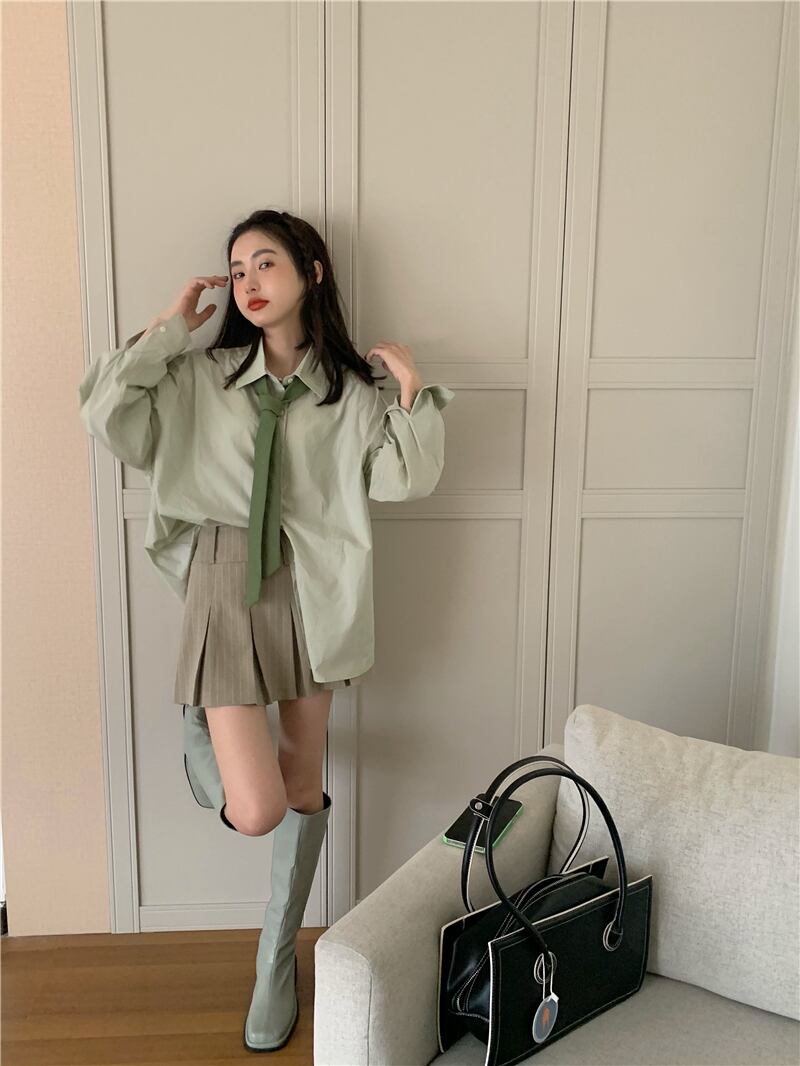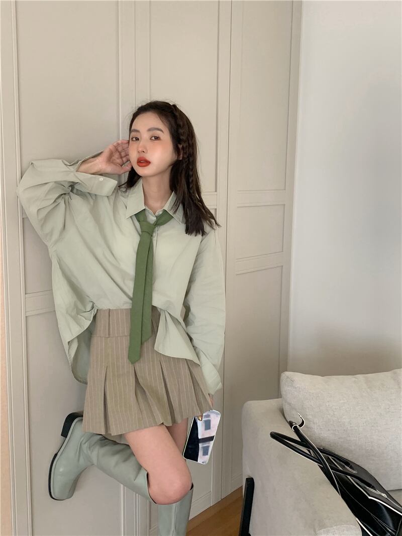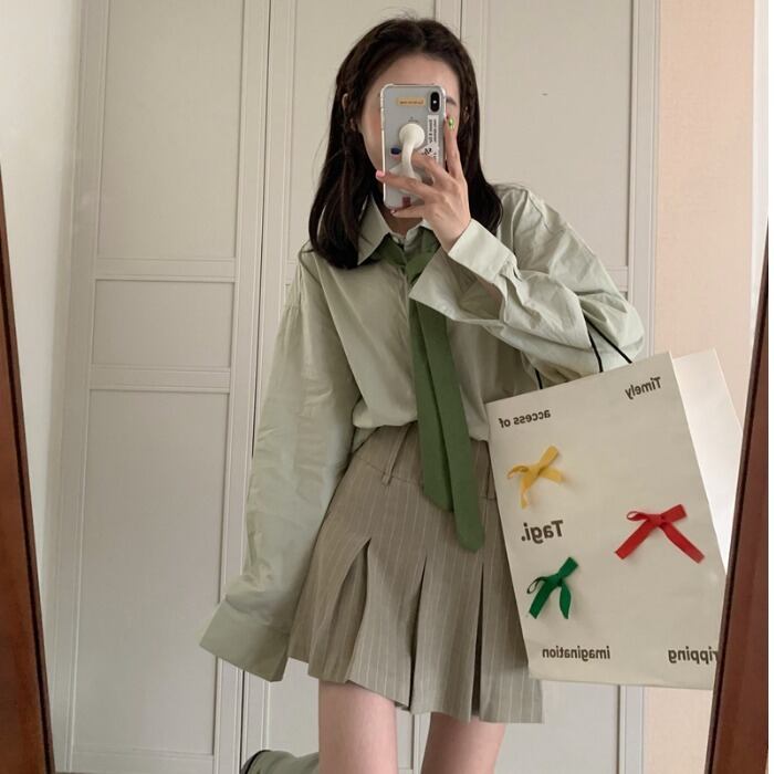 色:緑のシャツ,縞模様のスカート,緑のネクタイ