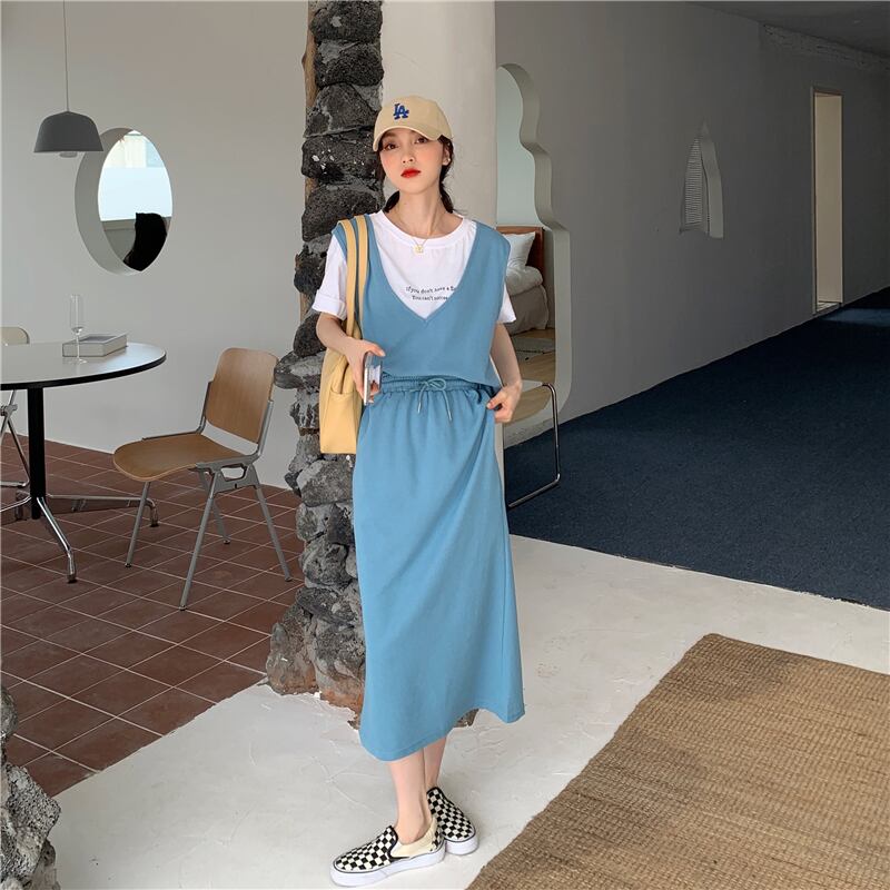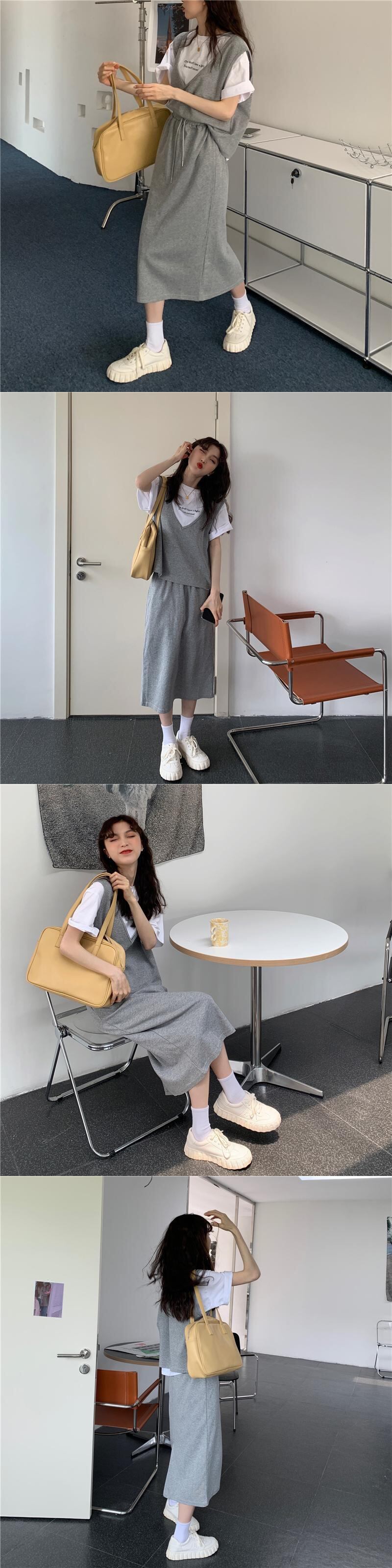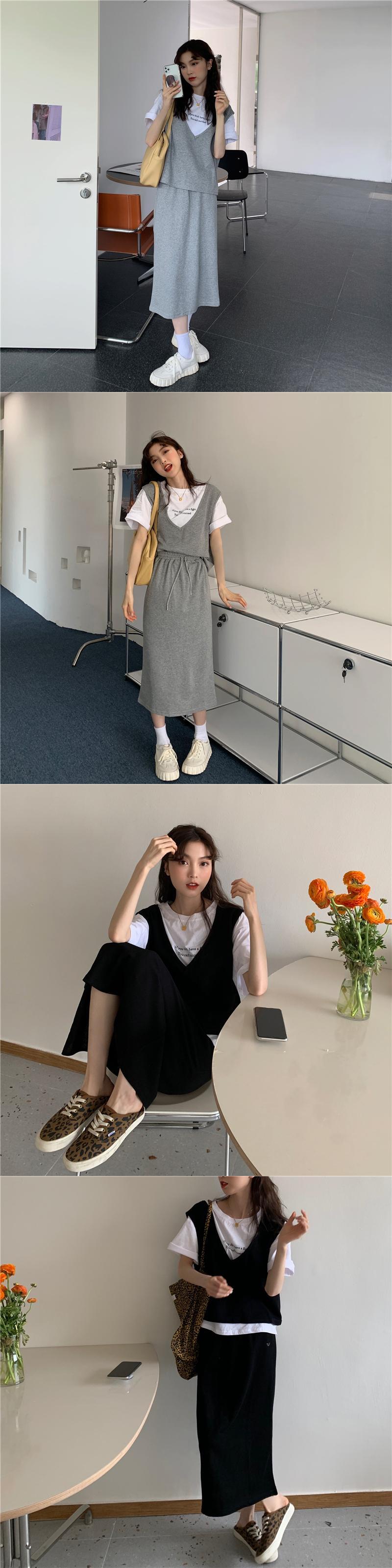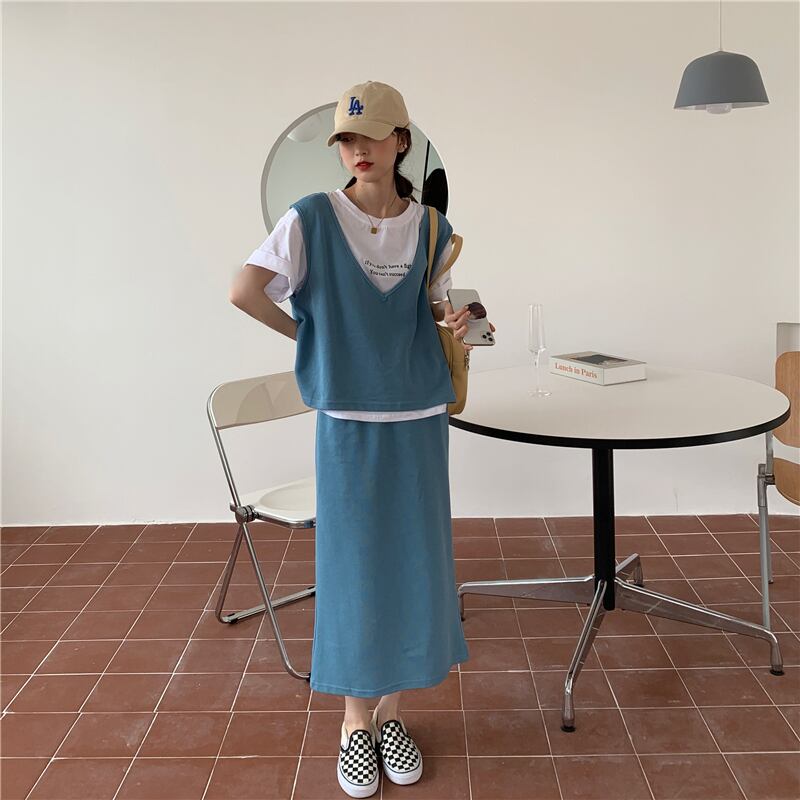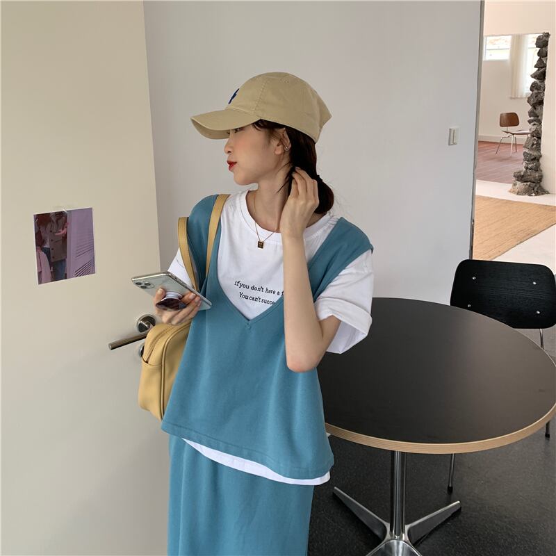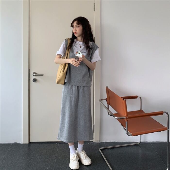色:ホワイトレターTシャツ,ミストブルーベスト+ハーフスカート,グレーベスト+ハーフスカート,ブラックベスト+ハーフスカート