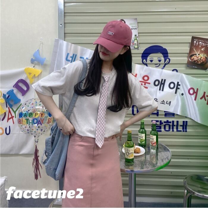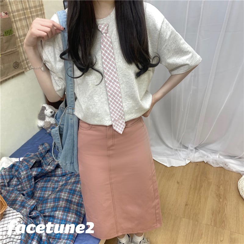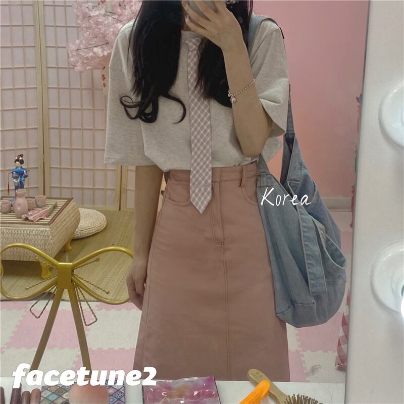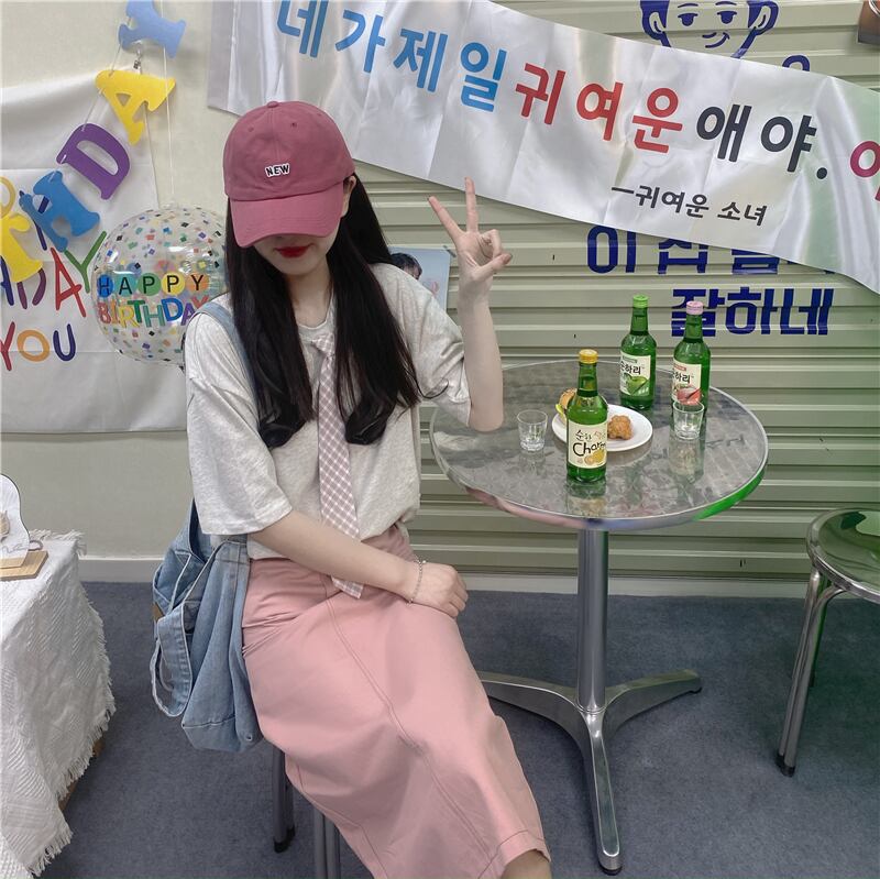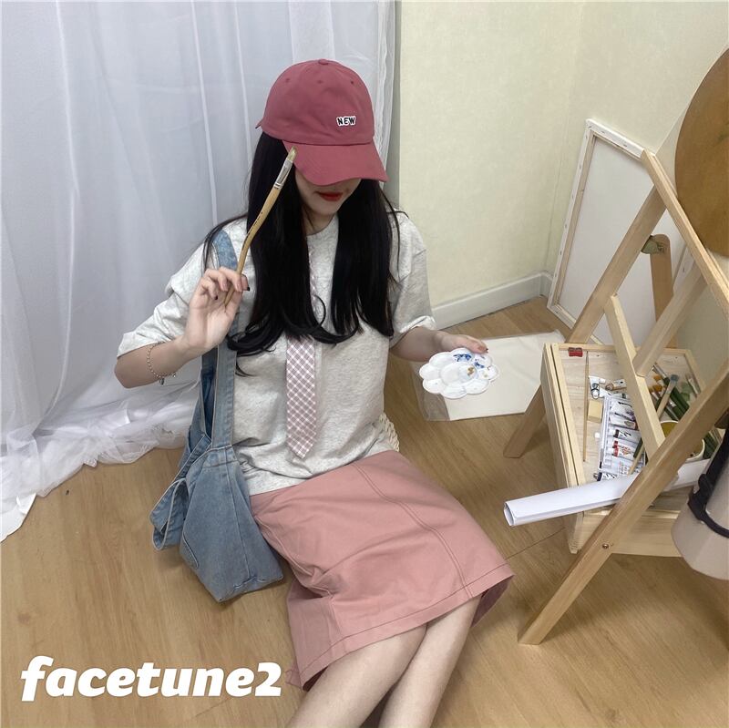 色:グレーアプリコットTシャツ,ピンクのスカート