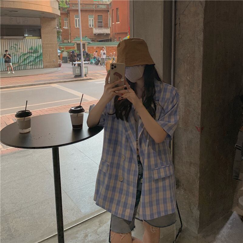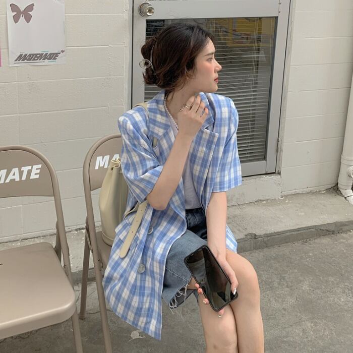 ブルー格子柄ジャケット カジュアル薄手スプリングサマー 春物 夏物 モンロー12854762146