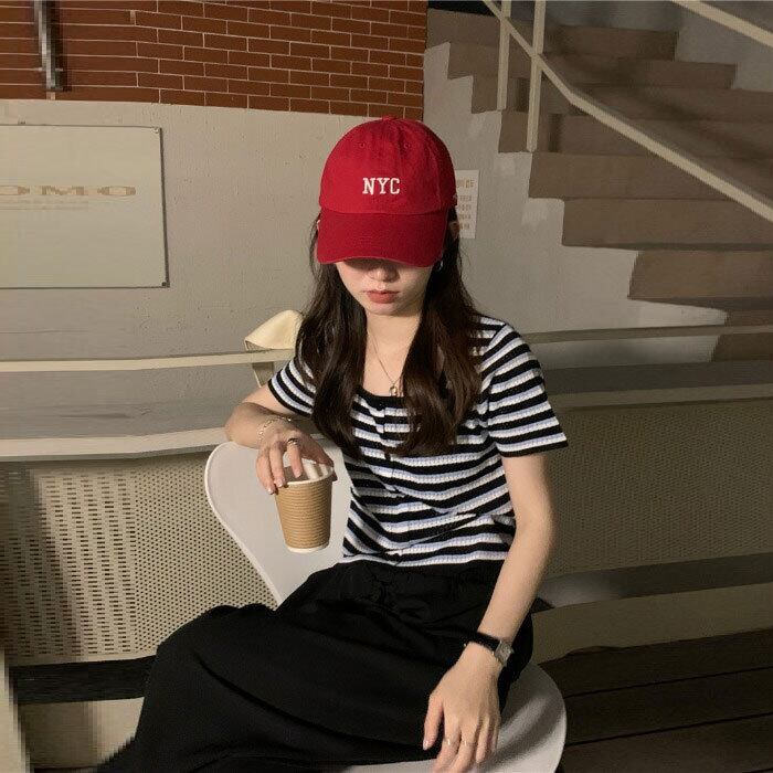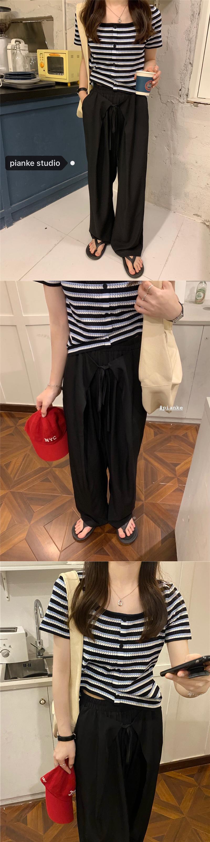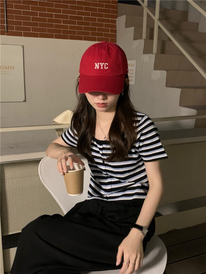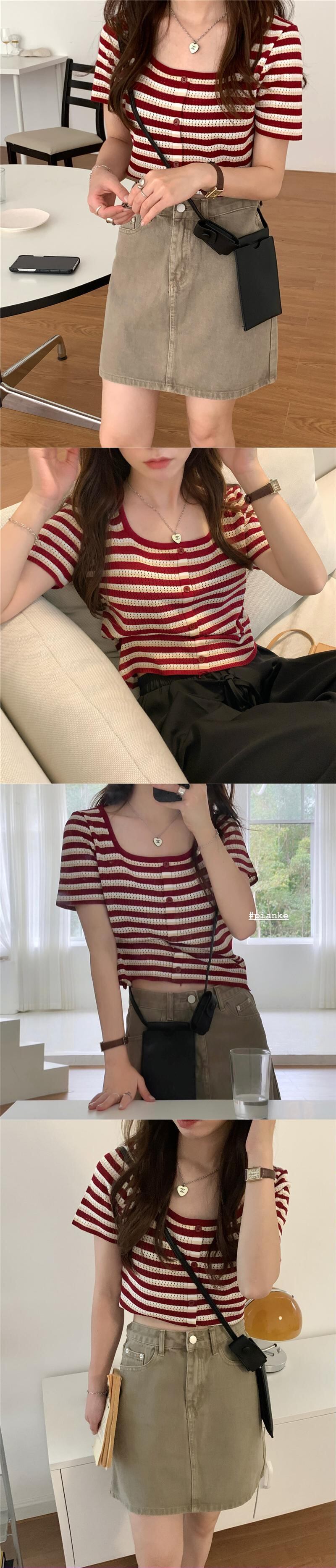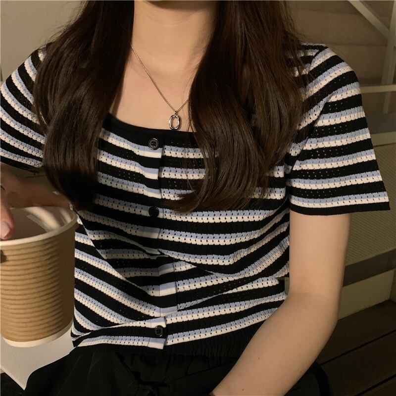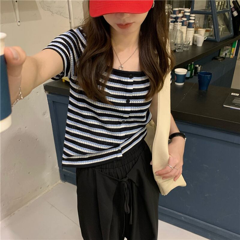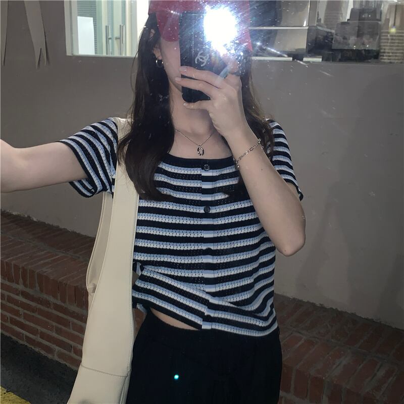 ストライプスリムショートTシャツ サマーニットクロップトップ トップス 夏物 スクウェア モンロー26686285856