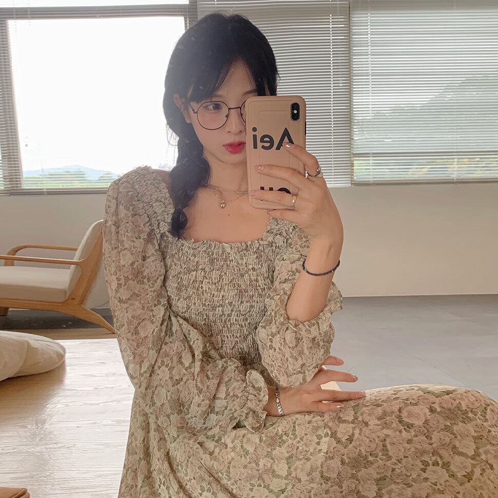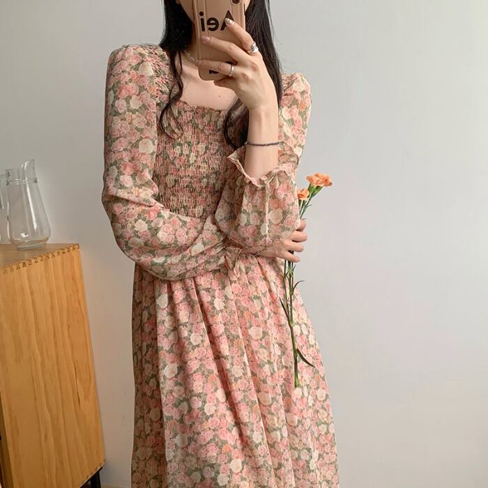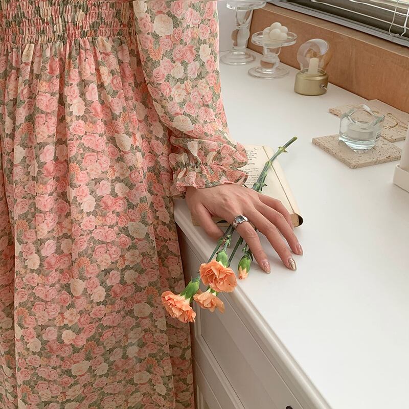 カラーフローラルドレス サマーロングスカート ピンク 大人ガーリー スウィート キュート カジュアル 夏物 花柄 スクウェア モンロー85566561630